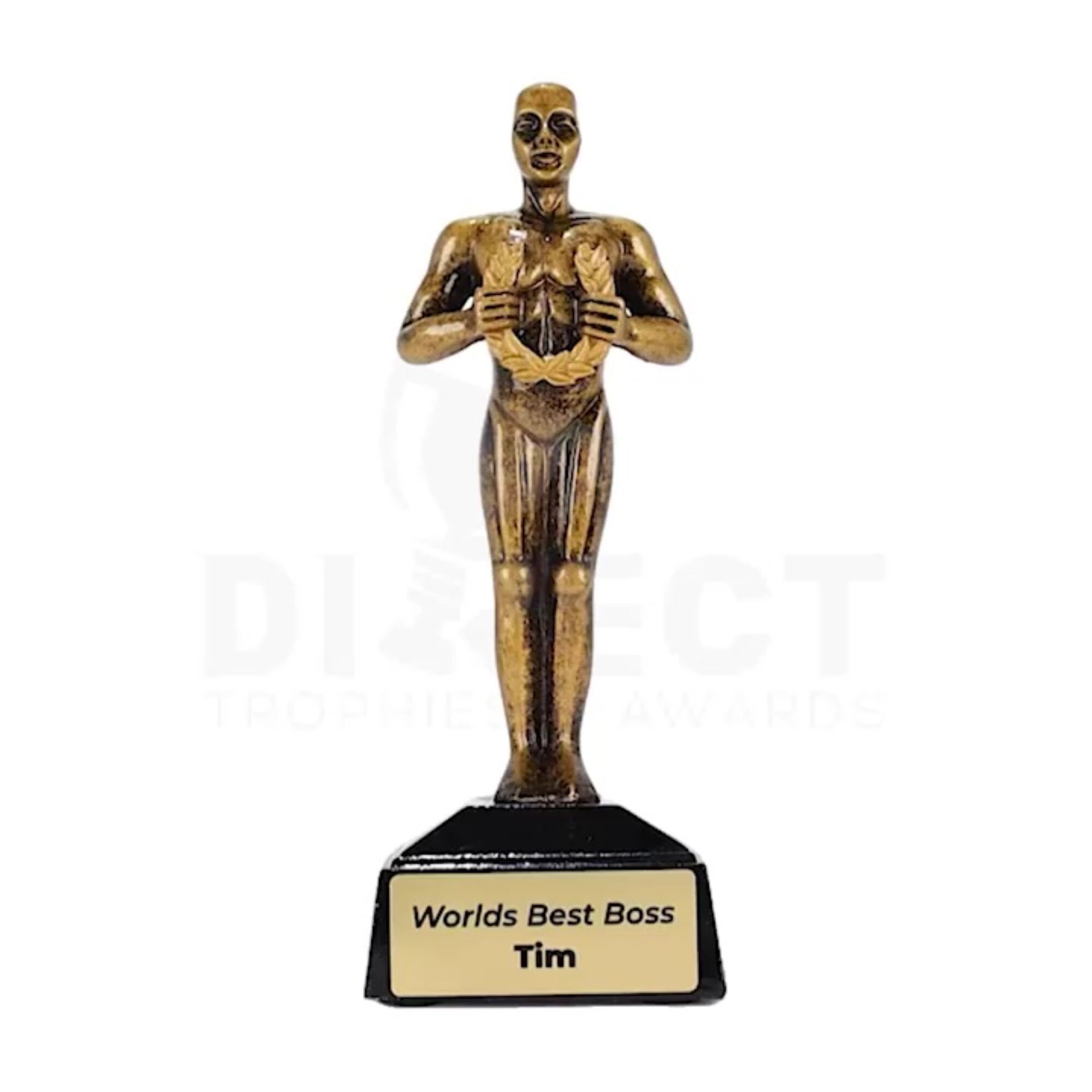 Introducing the Achievement Statue Trophy: A timeless symbol of success and victory. This exquisite trophy showcases a classic icon statue and is finished in an elegant combination of antique gold and black. Available in 2 sizes, it is the perfect choice for your award ceremony or presentation event. Enjoy the added perk of free laser engraving to personalize your trophy.