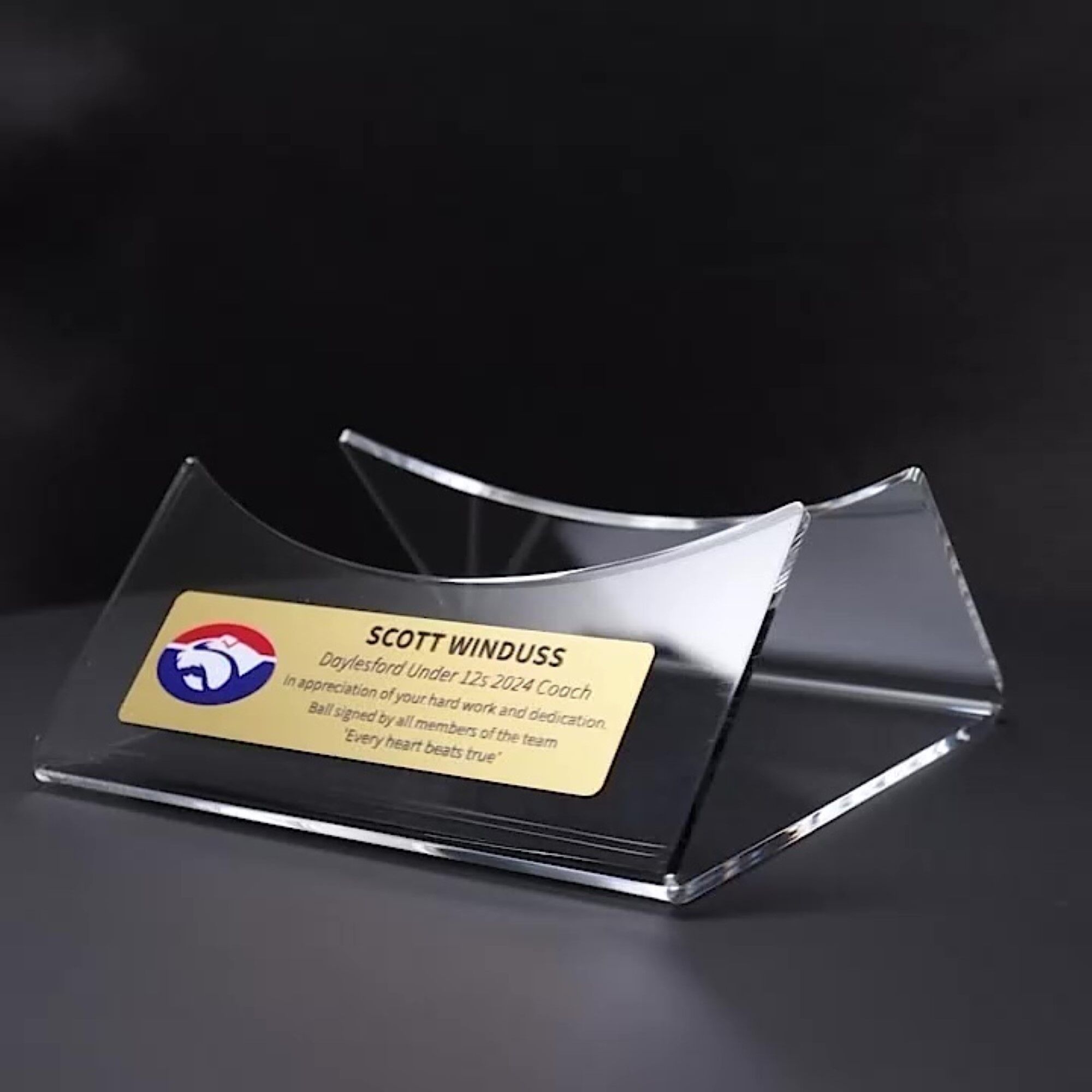 Excellent value for this stylish acrylic ball holder that can be used for different sports including Aussie Rules, Rugby, Soccer and Netball. Considerable space for your engraving. Great award for top performers and perfect for coaches, managers and officials looking to mark a milestone.