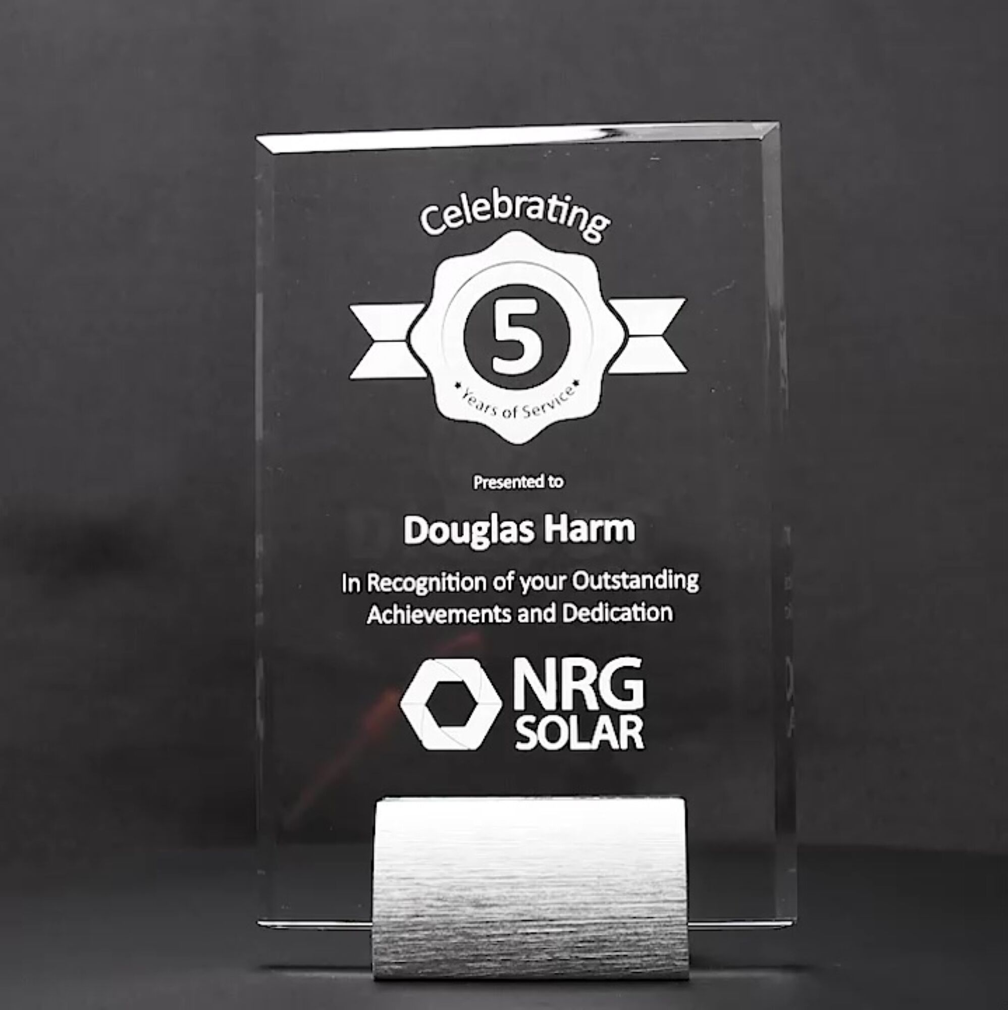 Brilliant mix of acrylic and metal provides an excellent corporate style award option. The brushed metal – detachable – base elevates the design of the award. Available in 3 sizes, supplied in gift box.
