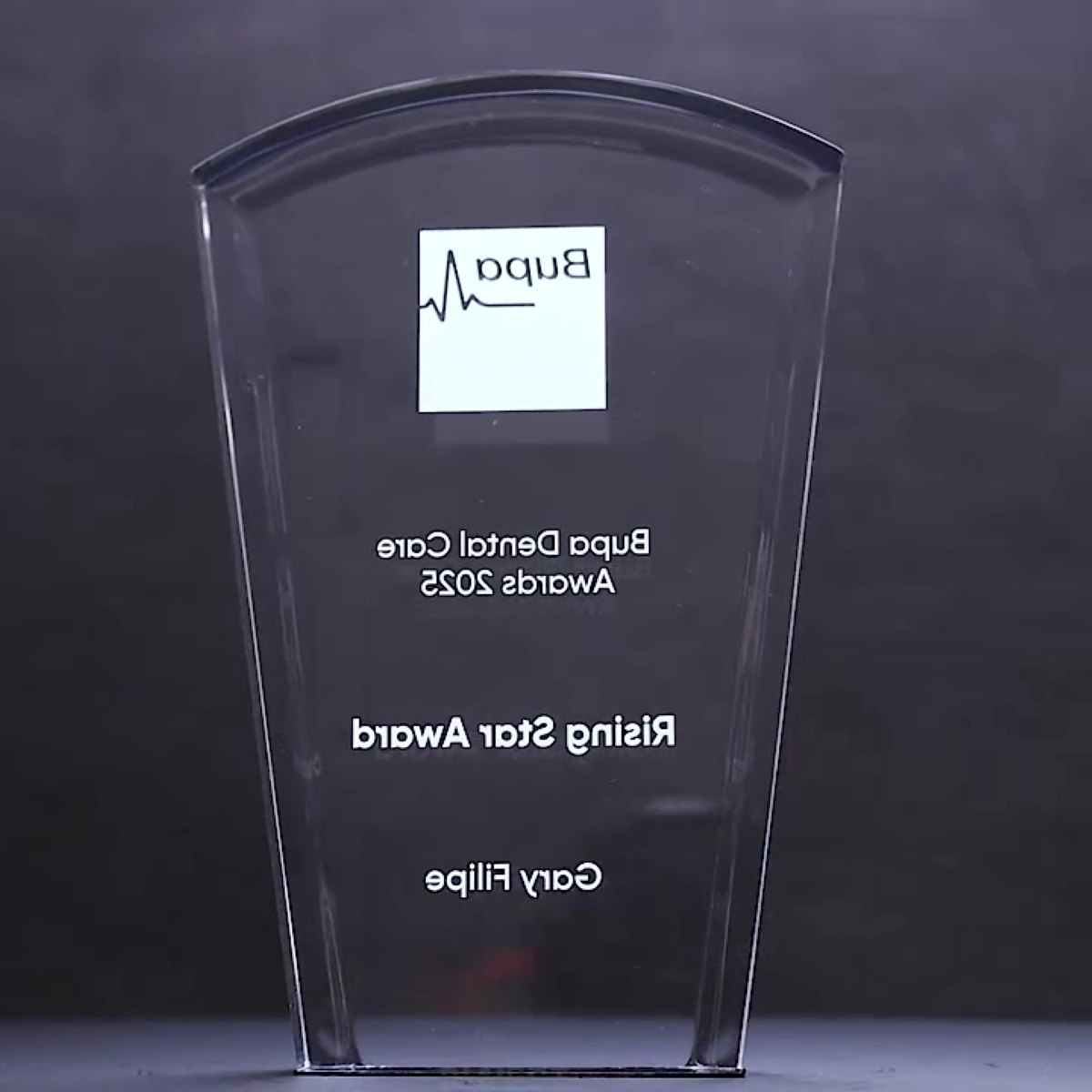 The ‘Solar’ series of acrylic awards present multi-coloured options – a self-standing design ideal for personalisation. Select blue, red or green for your event or presentation. Acrylic supplied in presentation gift box.