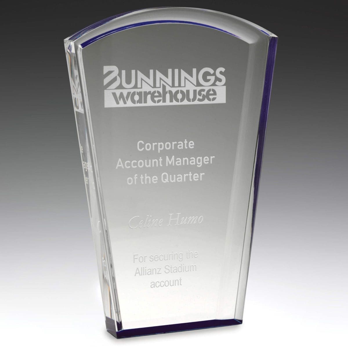 The ‘Solar’ series of acrylic awards present multi-coloured options – a self-standing design ideal for personalisation. Select blue, red or green for your event or presentation. Acrylic supplied in presentation gift box.