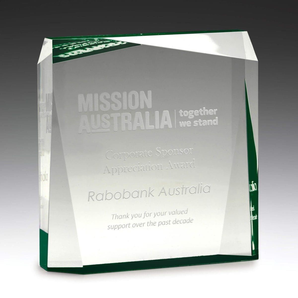 Prism’ Acrylic series offer a distinctive cut design to show off your personalisation requirements. Choose between blue, red or green awards. Supplied in presentation gift box.