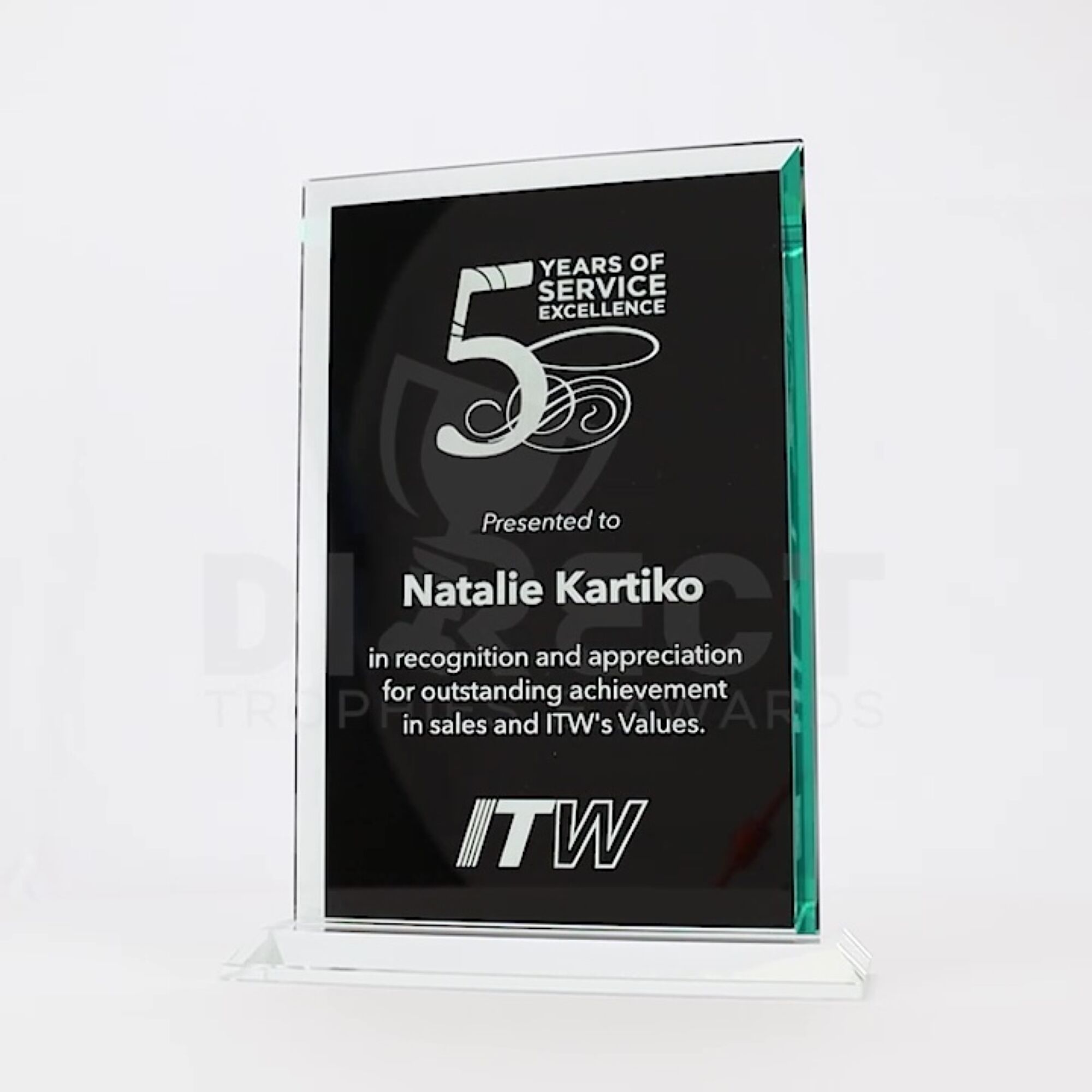 Introducing the Advert Black Glass Trophy: a contemporary series featuring a commanding design with a vibrant green panel that accentuates your custom engraving. Its striking aesthetic and vivid hue make it an ideal choice for your awards ceremony. Available in two sizes and elegantly packaged in a gift box.
