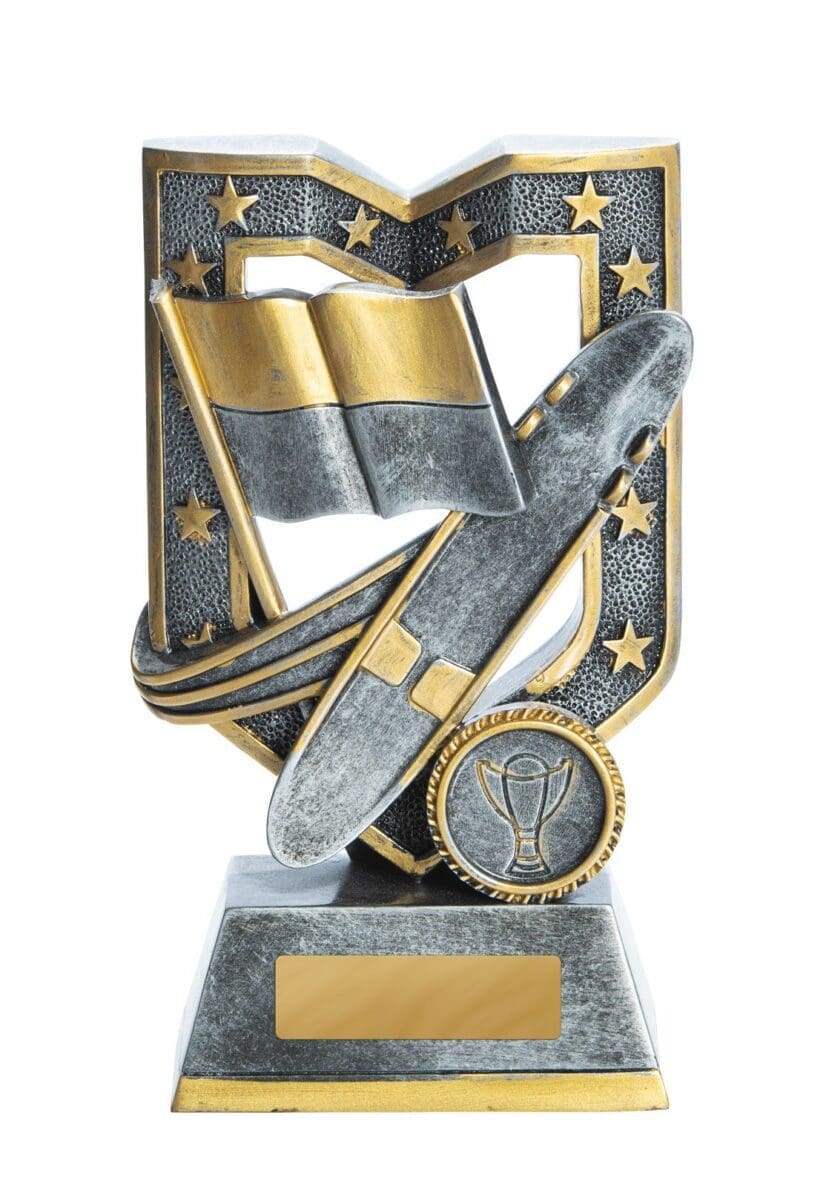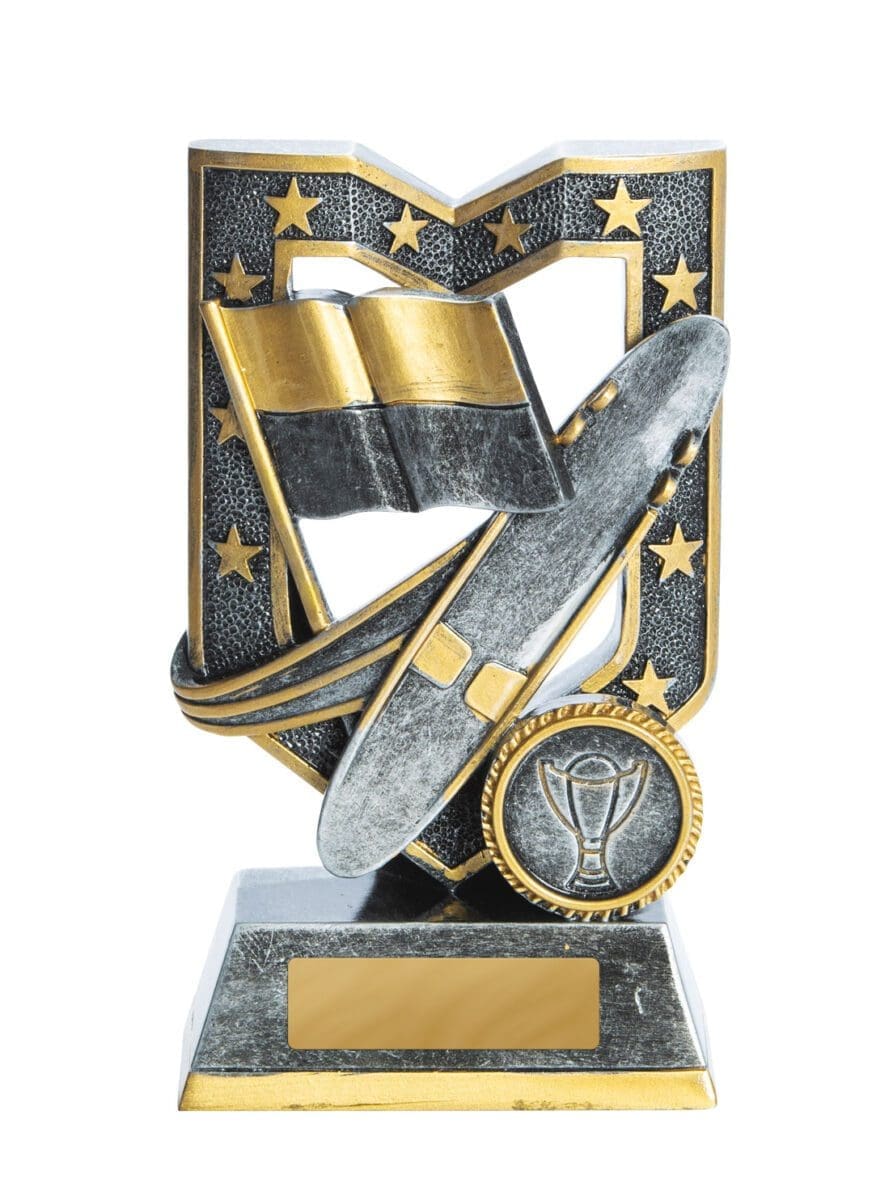 The Aegis Award Trophy is a great award trophy for any event. It?s a grand standing shield style design with star highlights that is made from resin material, silver with gold trim. It comes with free engraving and can be customized with your personalised logo if desired.