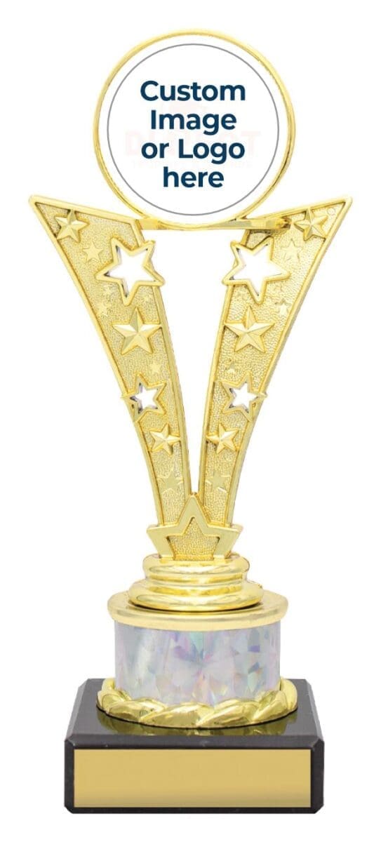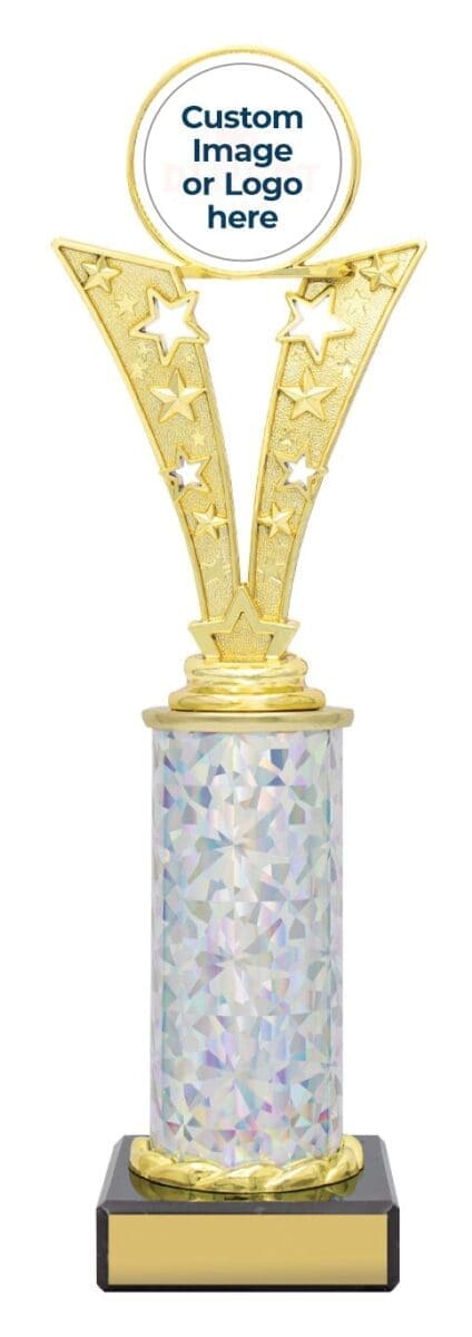 Aileron Wing Trophy: showcases a captivating blend of classic gold and silver with star-shaped cutouts. Its vibrant columns add a touch of color to the design. Available in multiple sizes, with Free Laser Engraving. Celebrate excellence with the Aileron Wing Trophy.