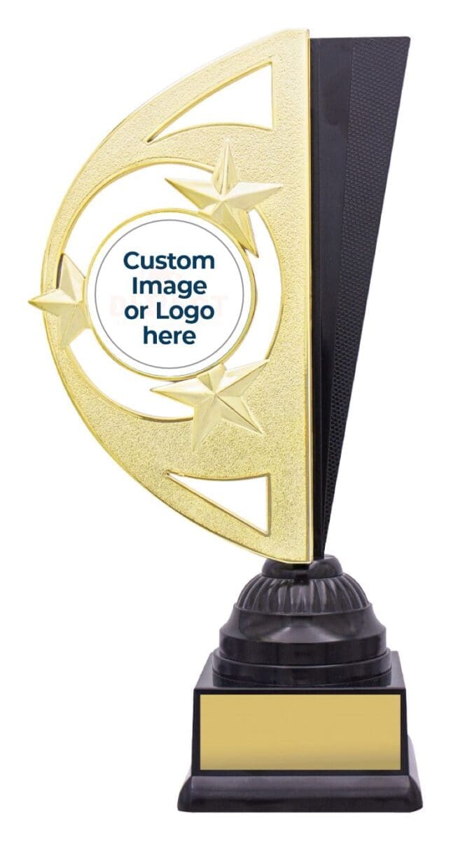 Introducing the Arcane Black Star Trophy Series, a captivating combination of black and gold with star accents and a prominent space for your custom image or logo. Available in multiple sizes and featuring free laser engraving, this series is perfect for recognizing outstanding achievements. With its sleek and mysterious design, it’s sure to make a lasting impression at any event or ceremony.