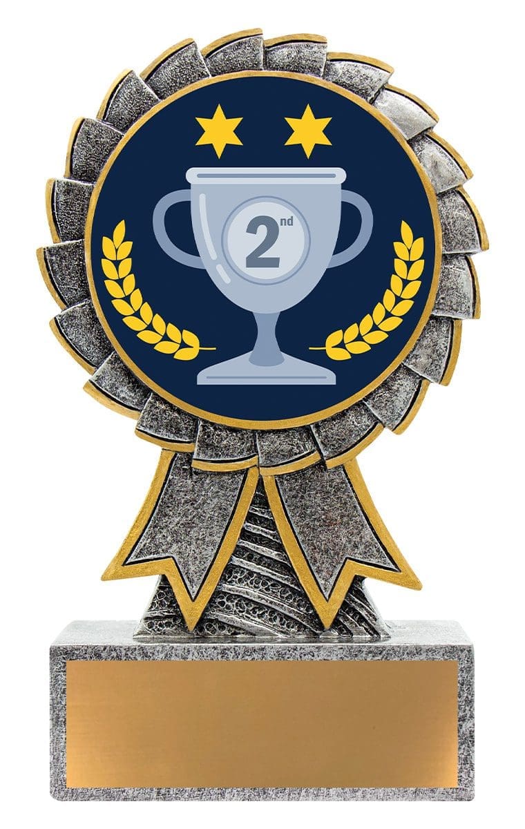 Aster series of trophies provides an affordable design that showcases a large 50mm colour image. Silver award with gold ribbon trims. Free engraving included.