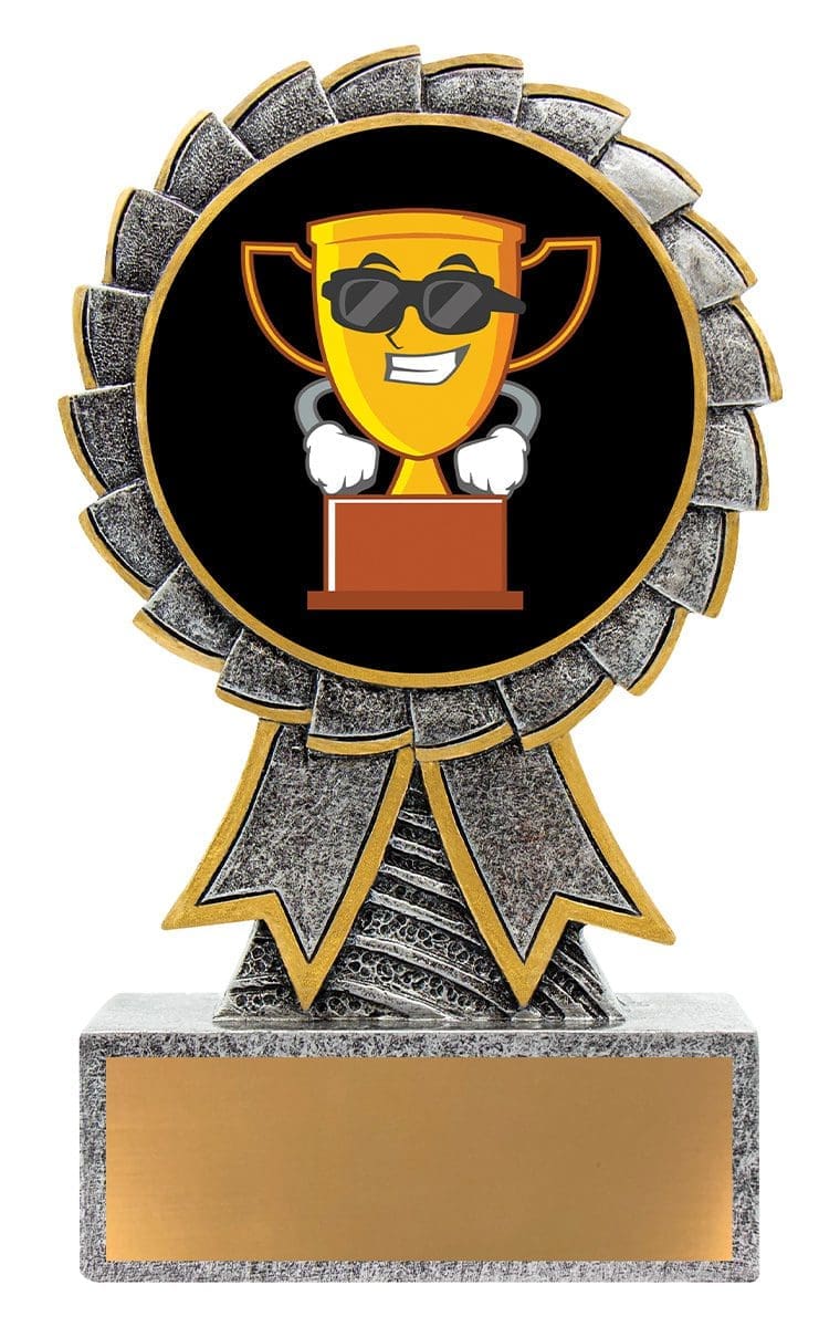 Aster series of trophies provides an affordable design that showcases a large 50mm colour image. Silver award with gold ribbon trims. Free engraving included.