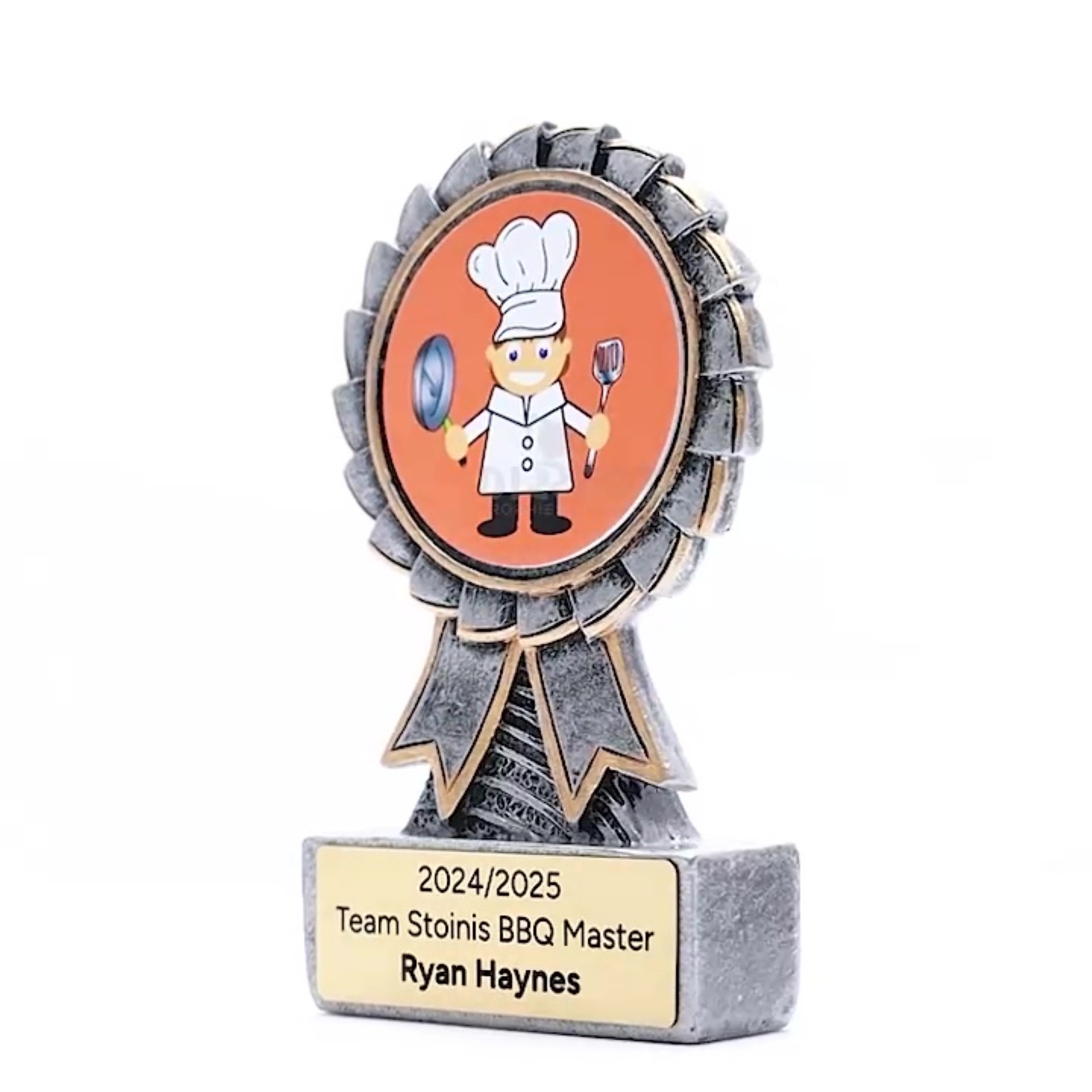 Aster series of trophies provides an affordable design that showcases a large 50mm colour image. Silver award with gold ribbon trims. Free engraving included.