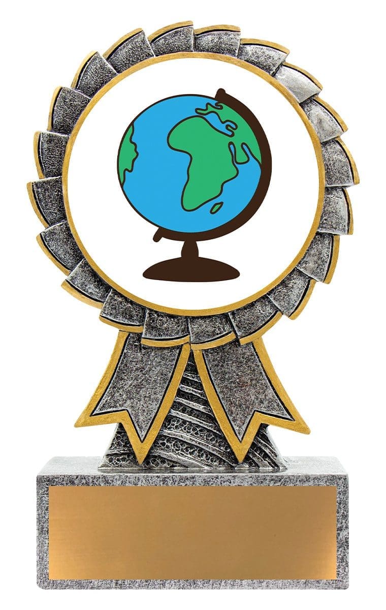 Aster series of trophies provides an affordable design that showcases a large 50mm colour image. Silver award with gold ribbon trims. Free engraving included.