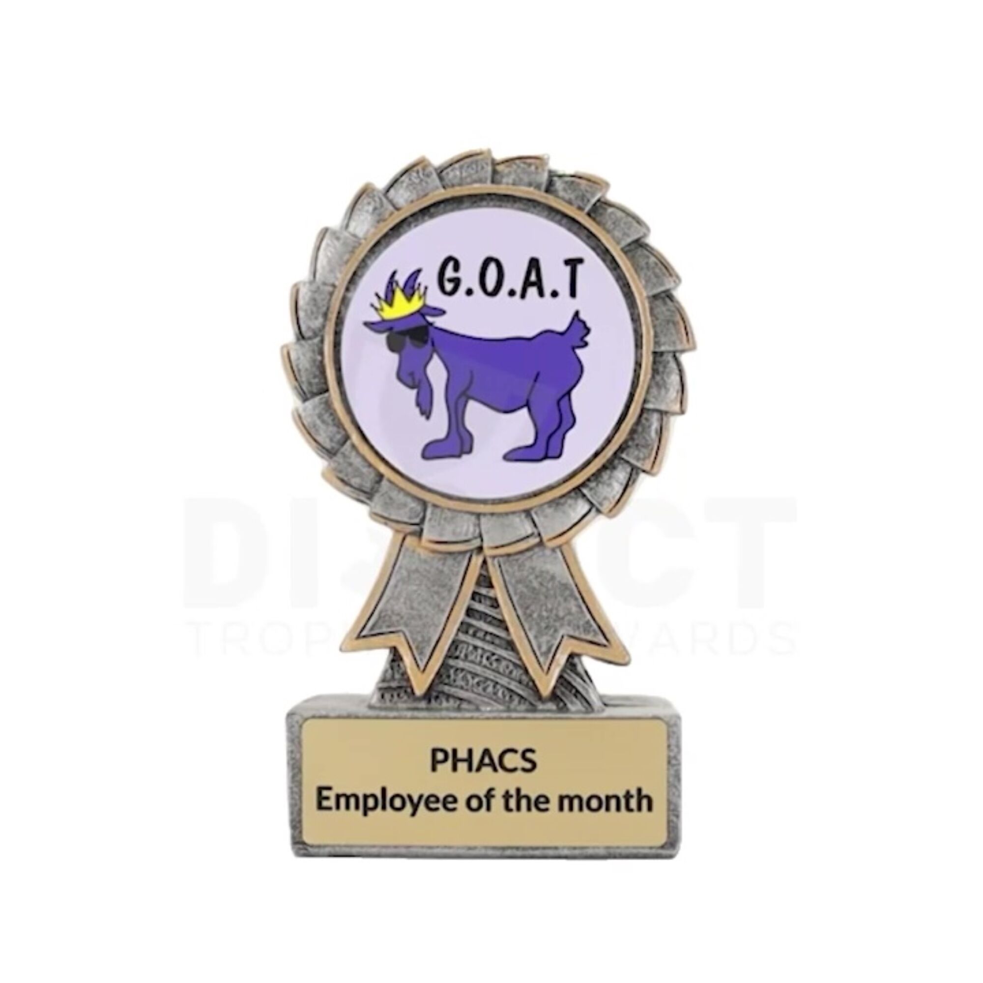 Aster series of trophies provides an affordable design that showcases a large 50mm colour image. Silver award with gold ribbon trims. Free engraving included.
