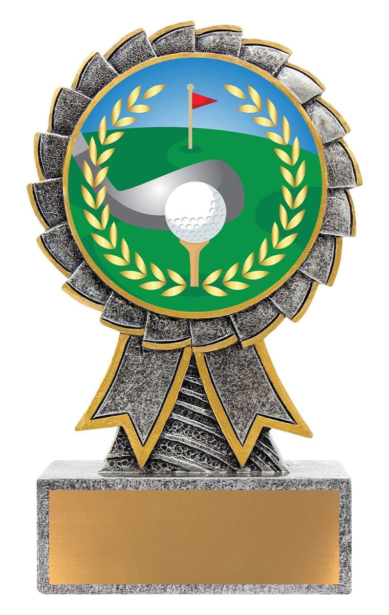 Aster series of trophies provides an affordable design that showcases a large 50mm colour image. Silver award with gold ribbon trims. Free engraving included.