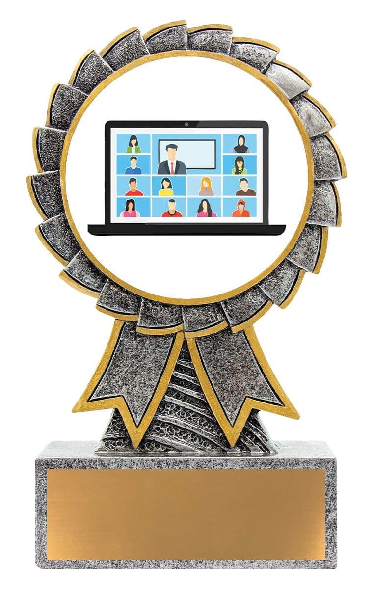 Aster series of trophies provides an affordable design that showcases a large 50mm colour image. Silver award with gold ribbon trims. Free engraving included.
