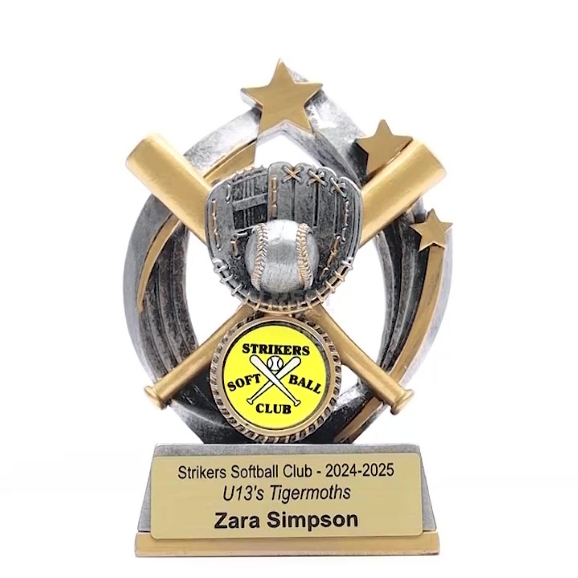 A futuristic design with star rising from a hallow backdrop finished in silver with gold colours. A affordable partipation award available in 3 sizes and option for a colour logo.