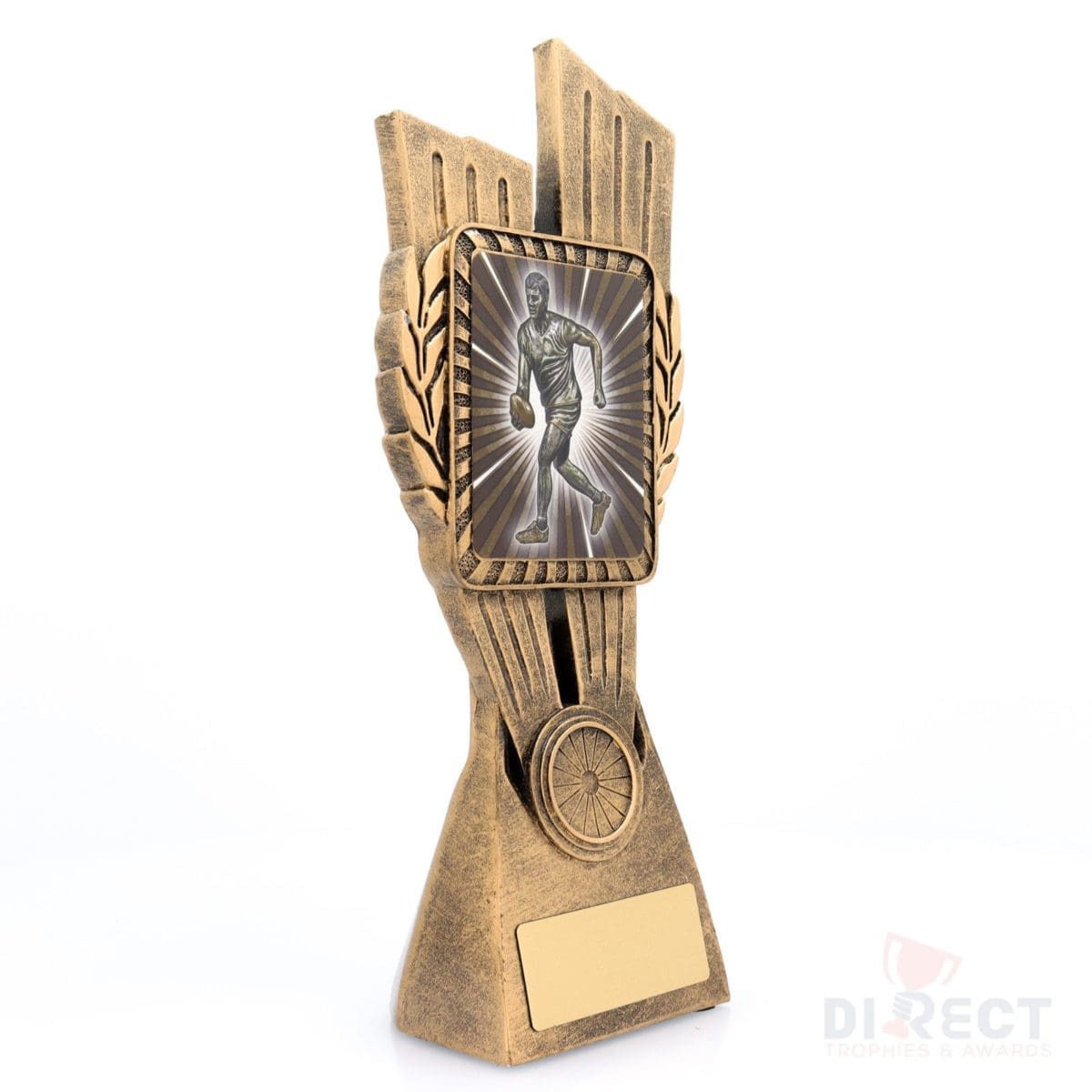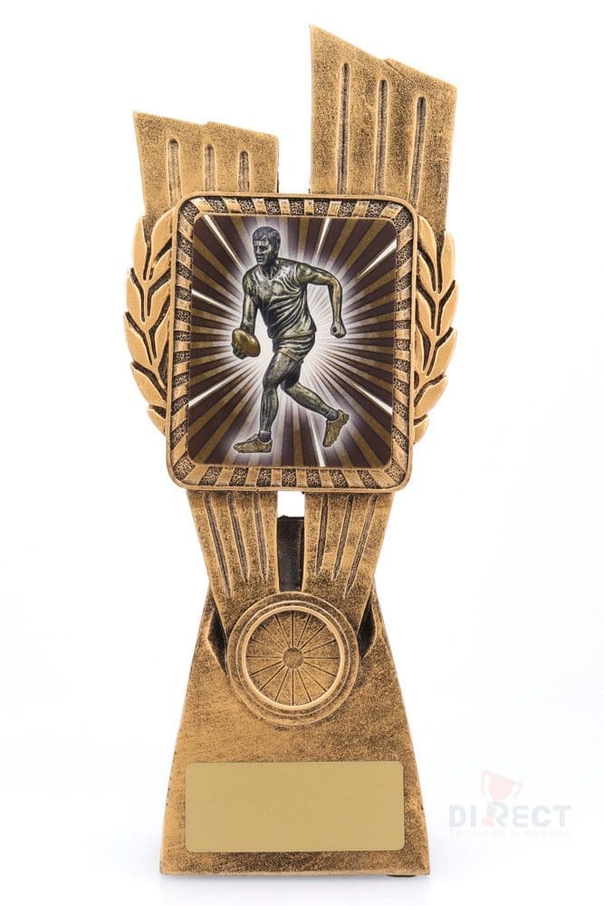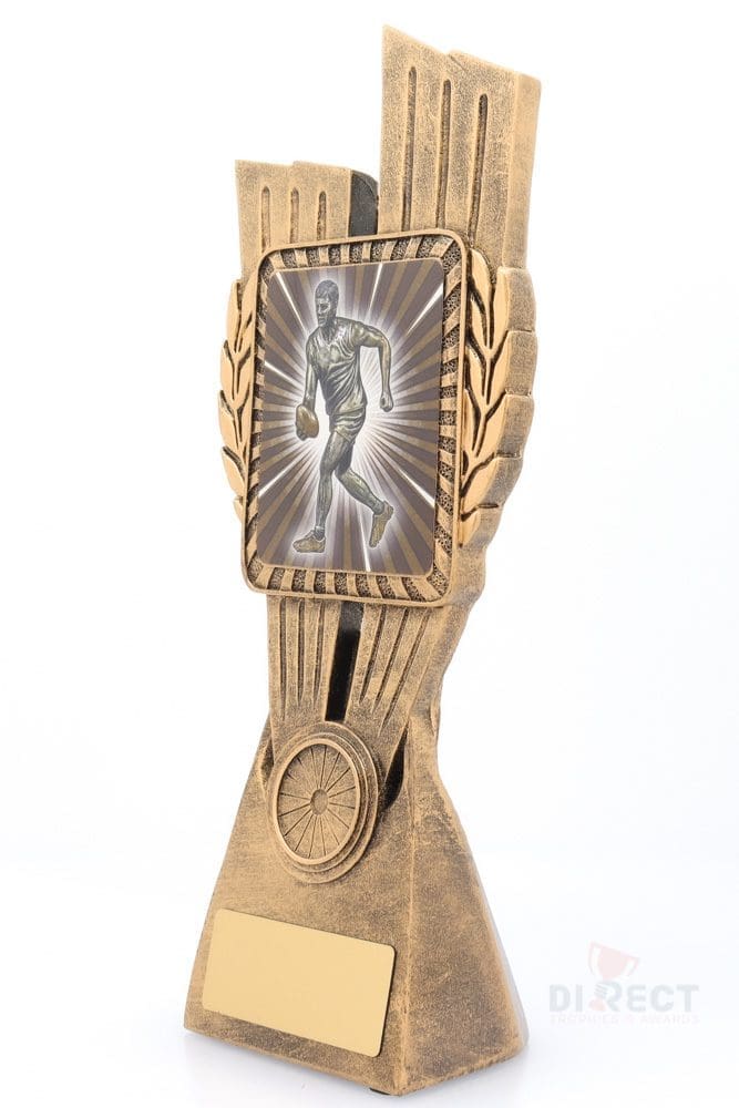 This Antique Gold Lynx Trophy is the perfect award to celebrate top achievements in your Aussie Rules football club or team. Featuring a classic wreath and vibrant footy handballer design, this trophy is customisable and available in 4 impressive sizes. Matching Lynx medal to complete the range of awards.