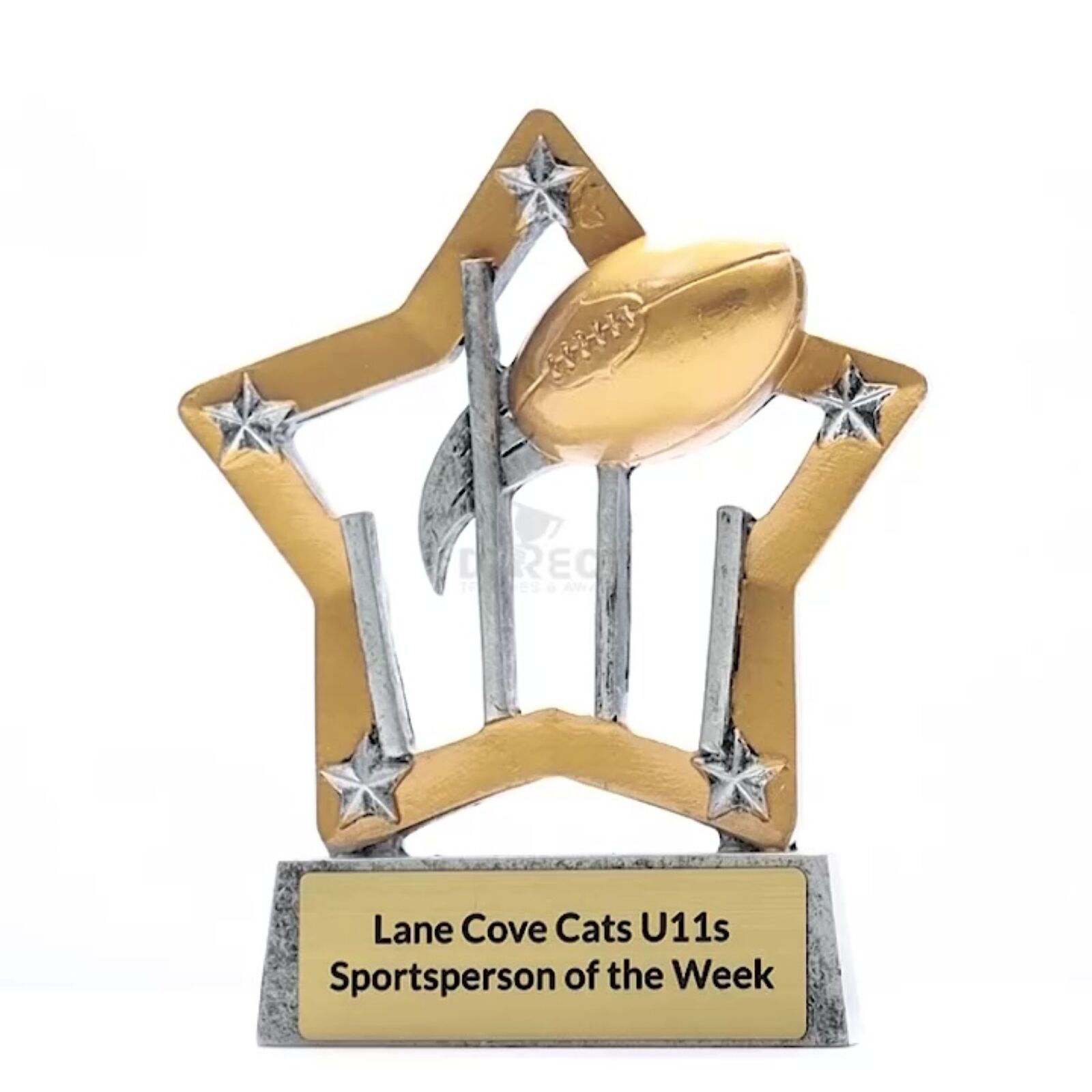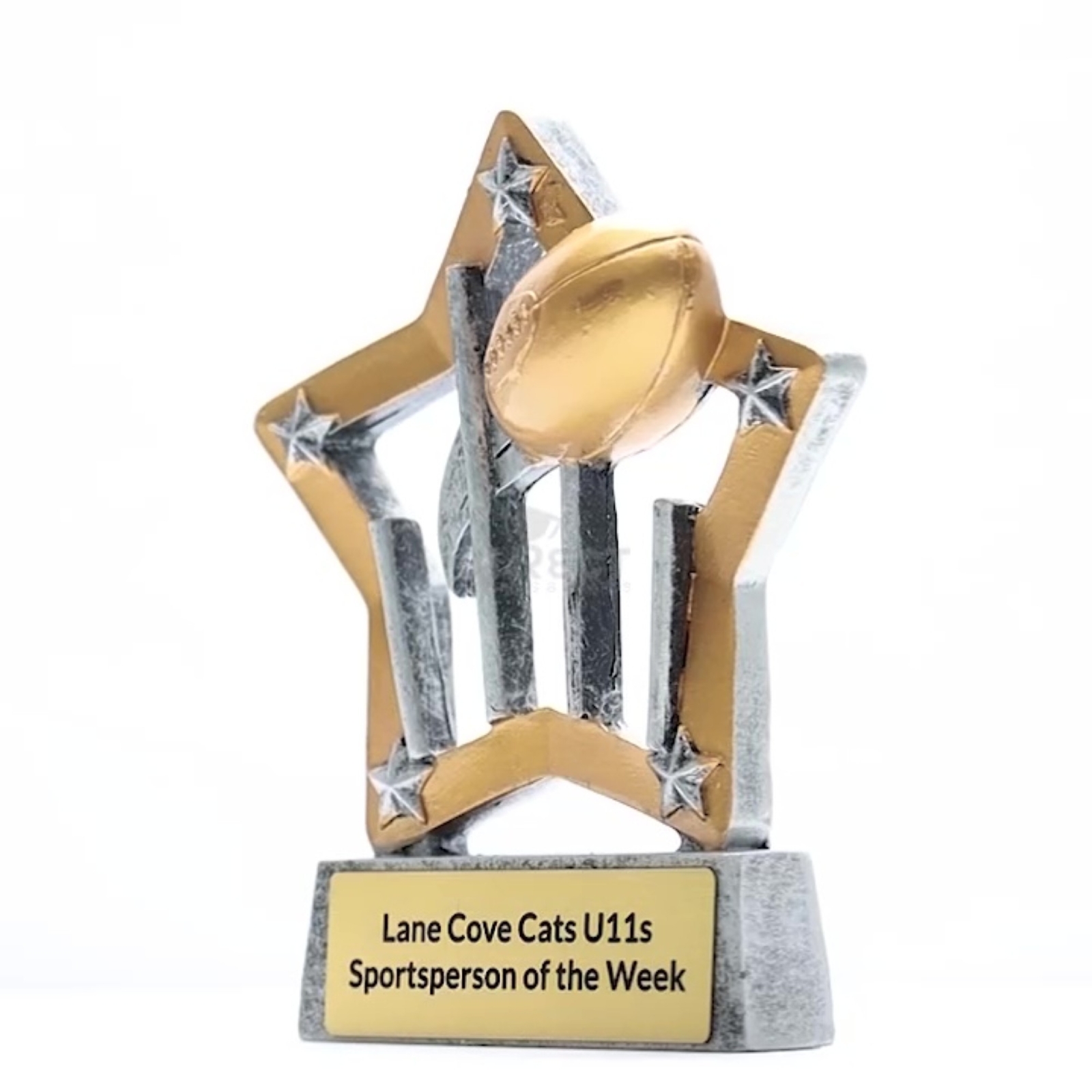 Affordable and popular Mini Star trophy for kids and players both male and female. An attractive star inspired design, classic silver and gold colours and at a budget price, well suited for footy club and team orders.