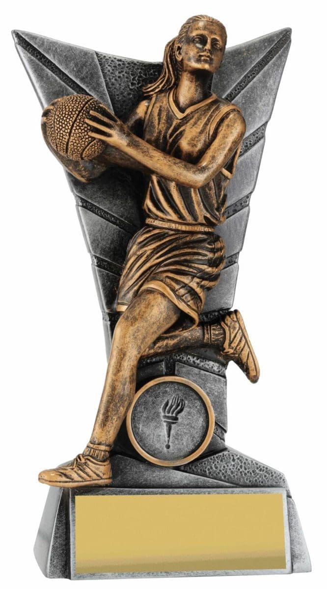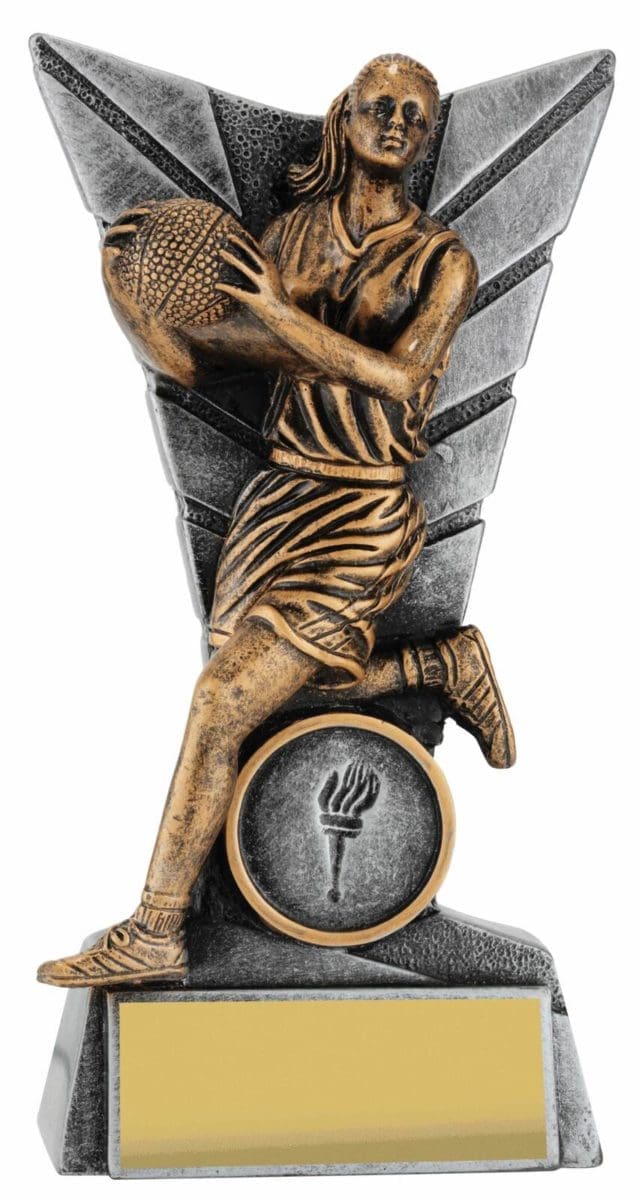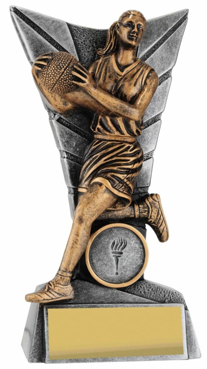 Dynamic silver backdrop for this trophy series frames the detailed player captured in action. Finished in antique gold this player series is available in Female and female and in multiple sizes to suit your award needs.