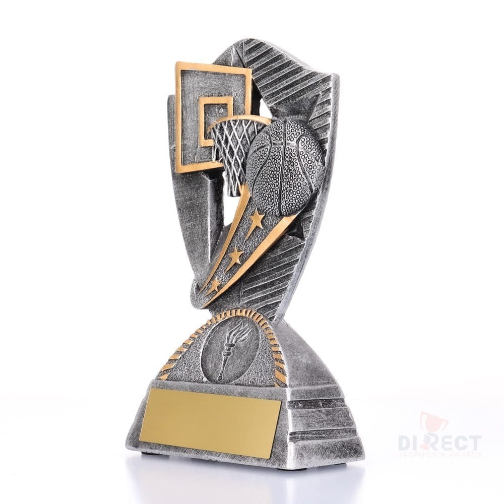 Brilliant basketball trophy for your team or club. The Gambit offers a dynamic theme in antique silver & gold – space for your custom logo.