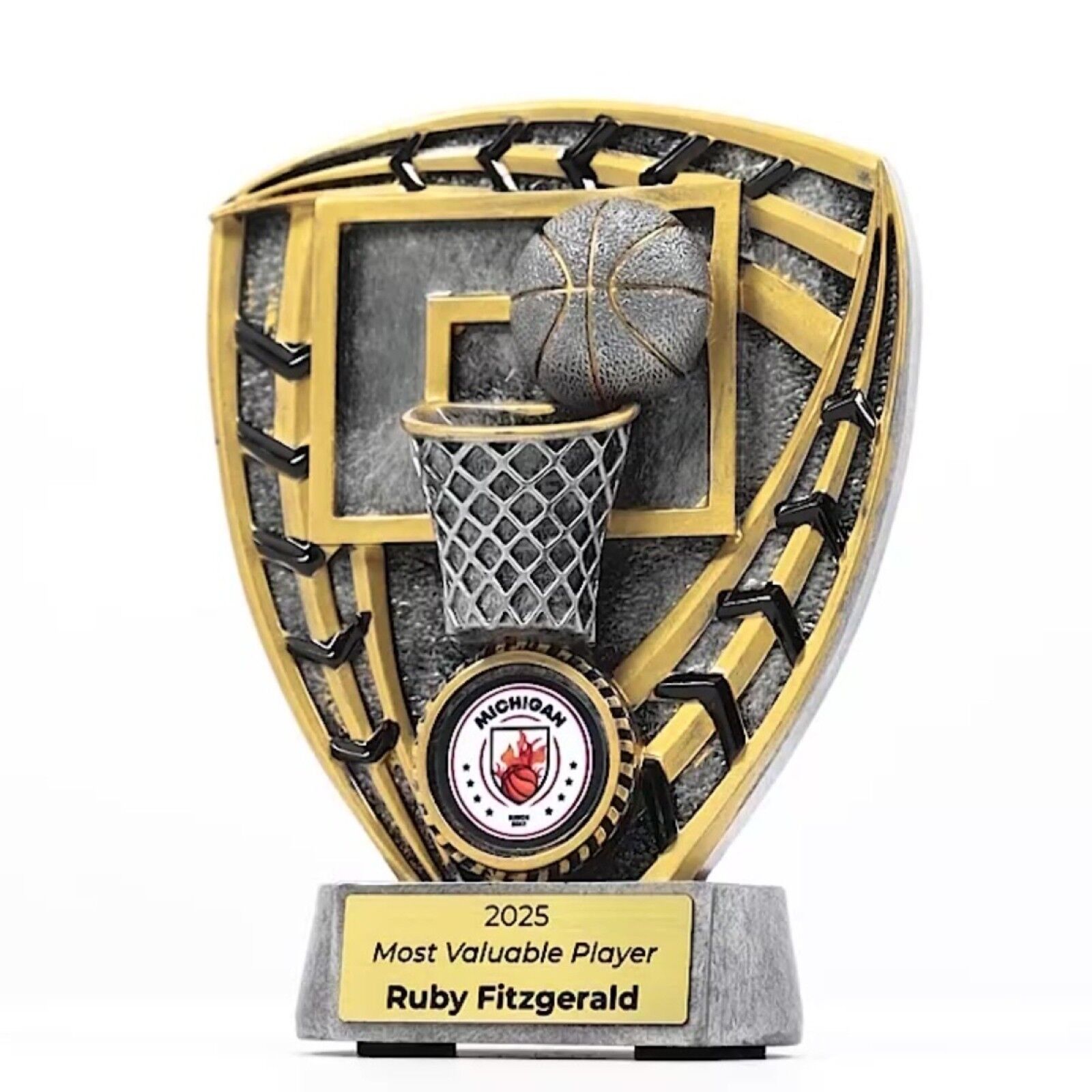 Bastion Series – A classic shield-shaped trophy featuring key sporting elements, finished in antique silver and gold. Offers space for your custom logo and is available in multiple sizes with complimentary laser engraving included.