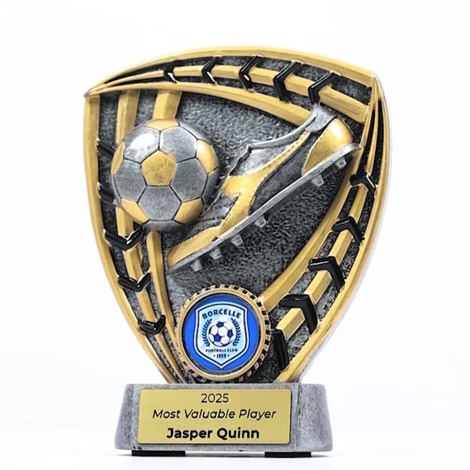 Bastion Series – A classic shield-shaped trophy featuring key sporting elements, finished in antique silver and gold. Offers space for your custom logo and is available in multiple sizes with complimentary laser engraving included.