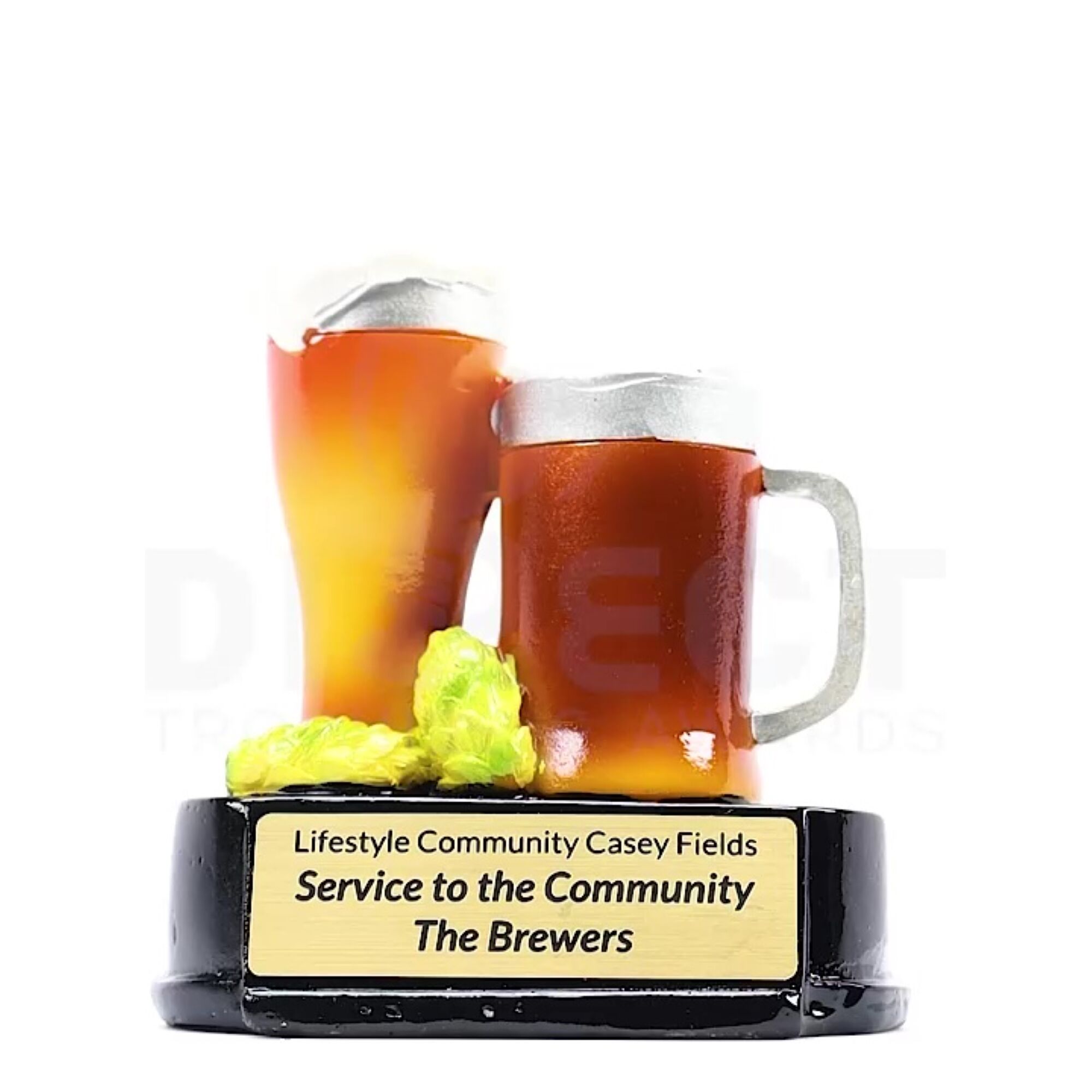 Trophy award celebrating beer, the essential hops ingredient and consumption (in moderation).