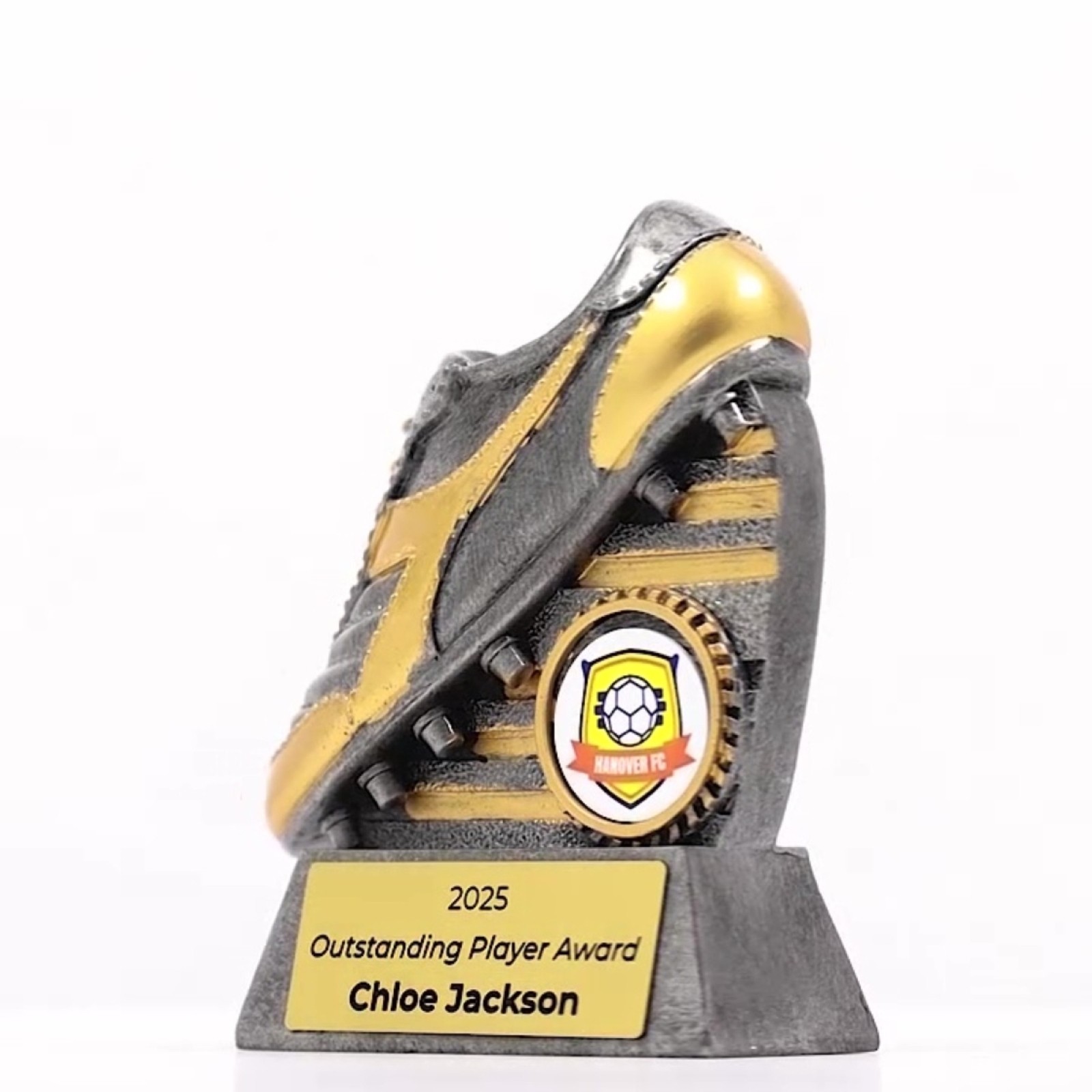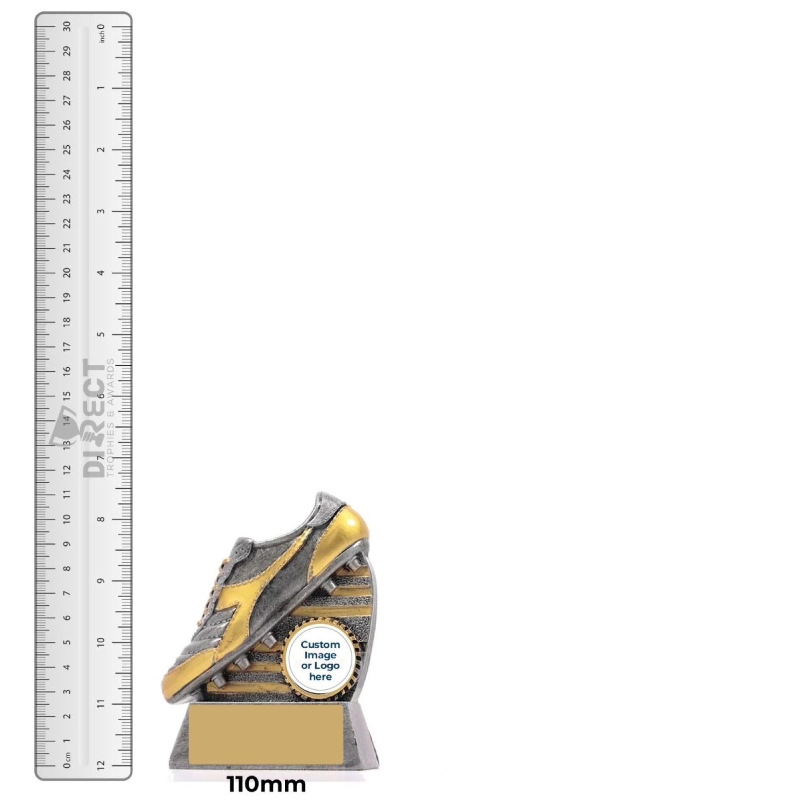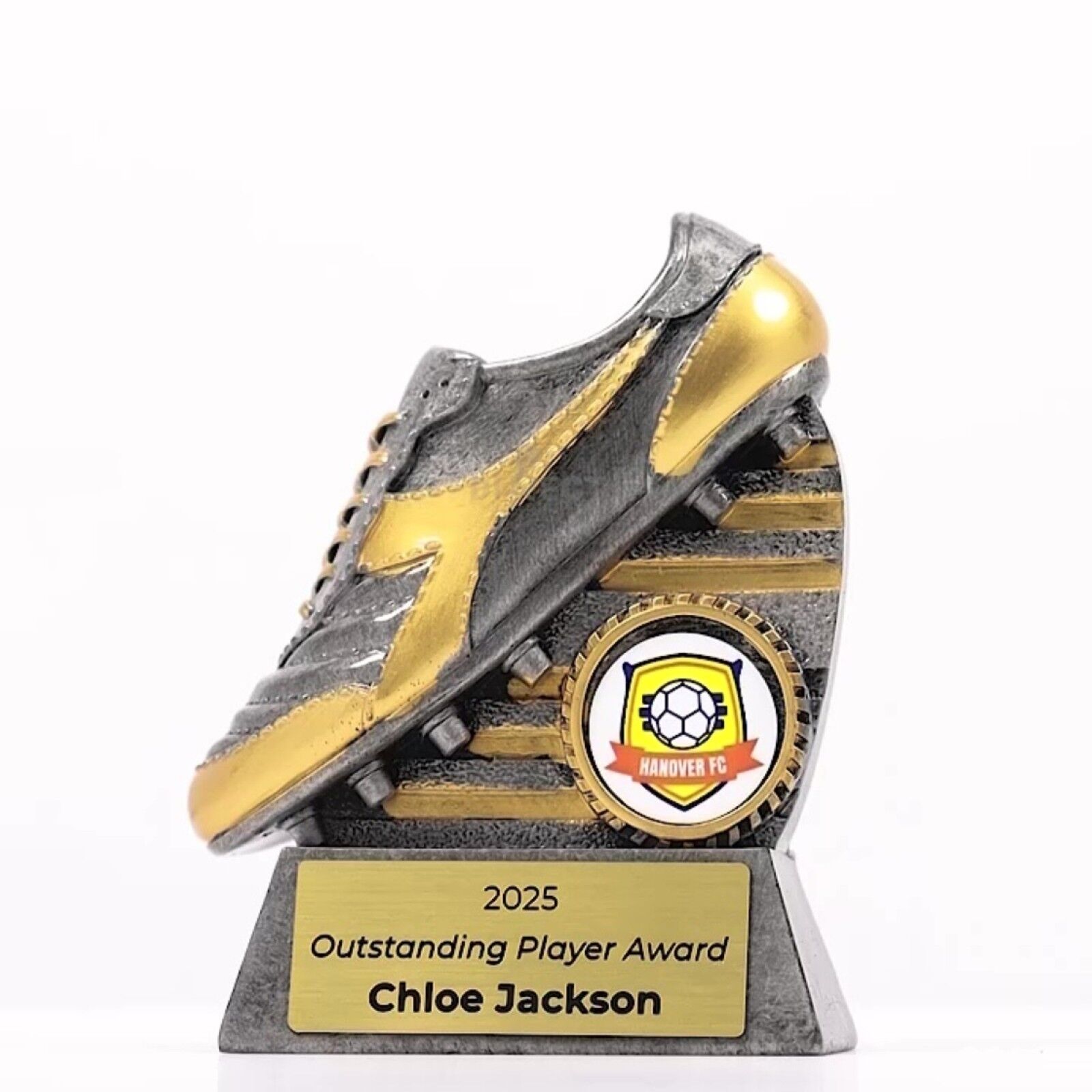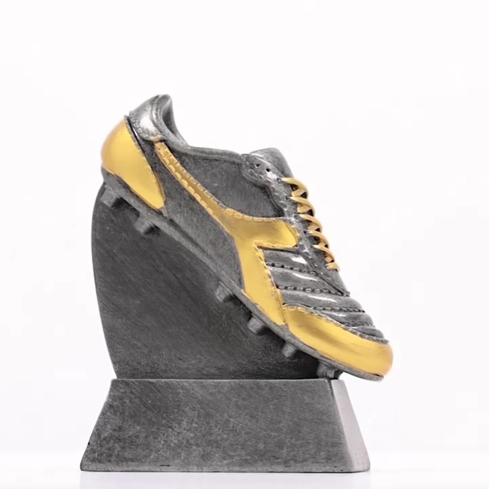 Betrix Series – Celebrate achievement with the Betrix Series, featuring a classic boot design in antique silver with striking gold highlights. Ideal for top goal scorers or participation awards, it offers space for your custom logo or image and includes complimentary laser engraving.