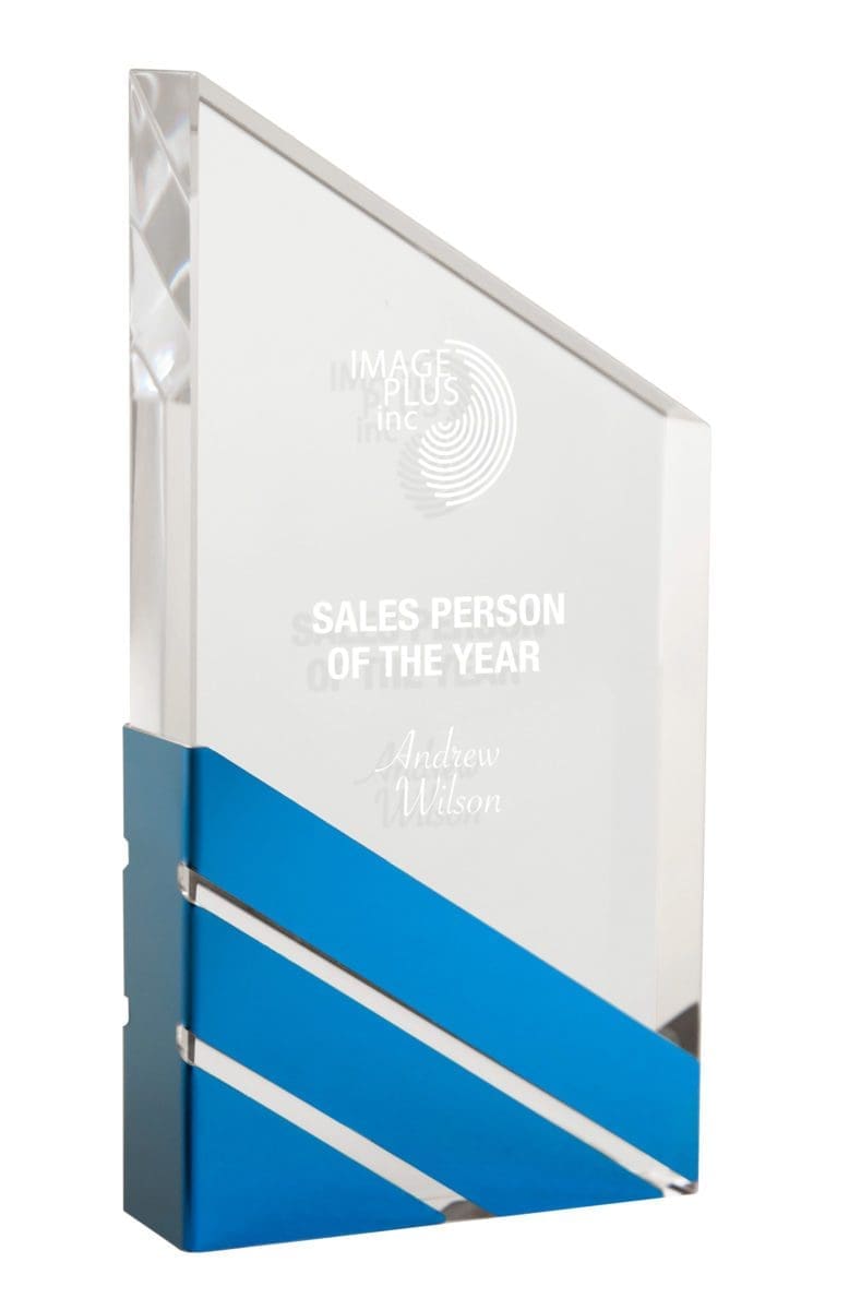 Our Blueship award is an elegant crystal trophy. This blue metallic ascent, blade shaped award is presented in a gift box and includes free engraving! An exclusive crystal trophy for any special event.