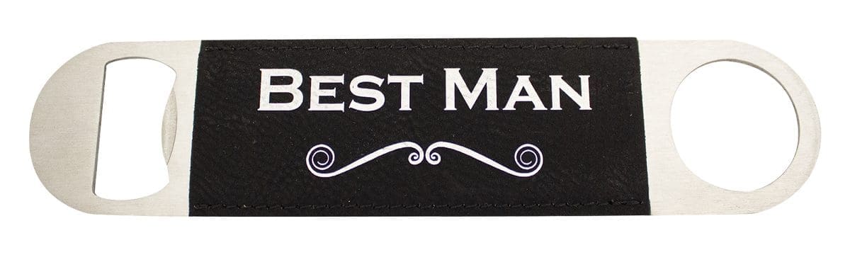 Stainless steel bottle opener gift item with leatherette for engraving purposes.