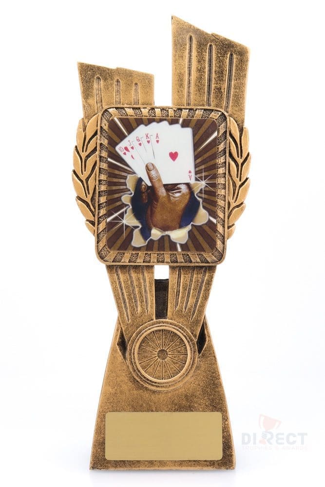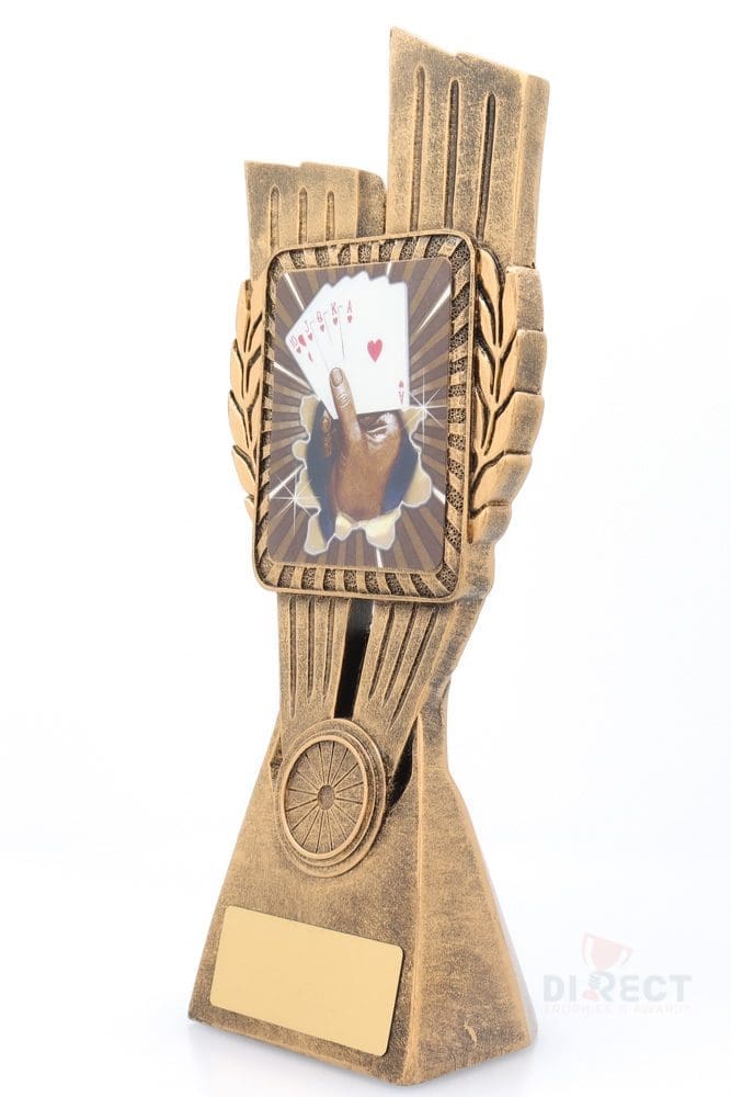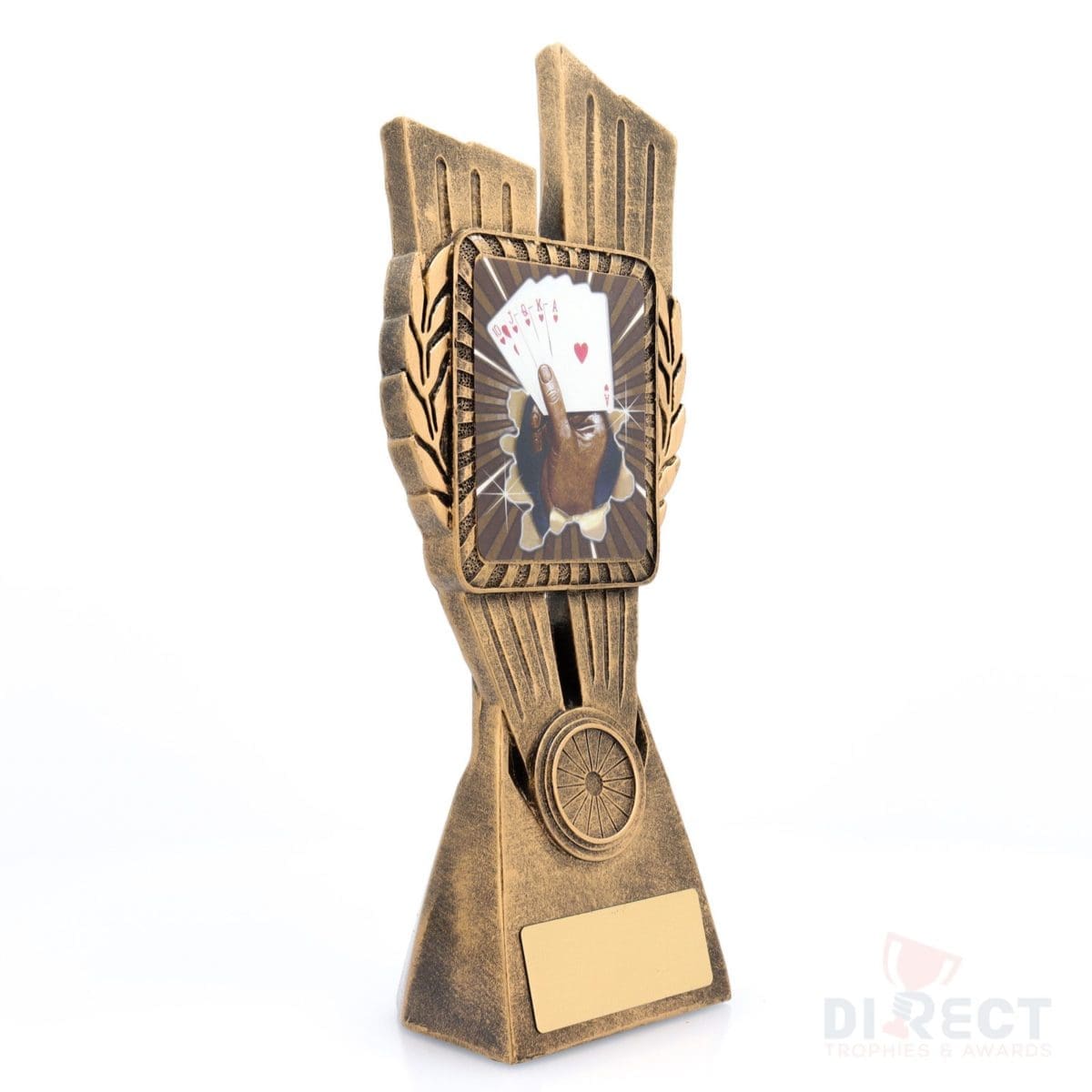 This Antique Gold Lynx Trophy is the perfect theme award for card playing events and activities. Series can be used as a recognition trophy and prize giving to recipients at your event or presentation. Featuring a classic wreath and vibrant design, these Cards trophies are customisable and available in 4 impressive sizes.
