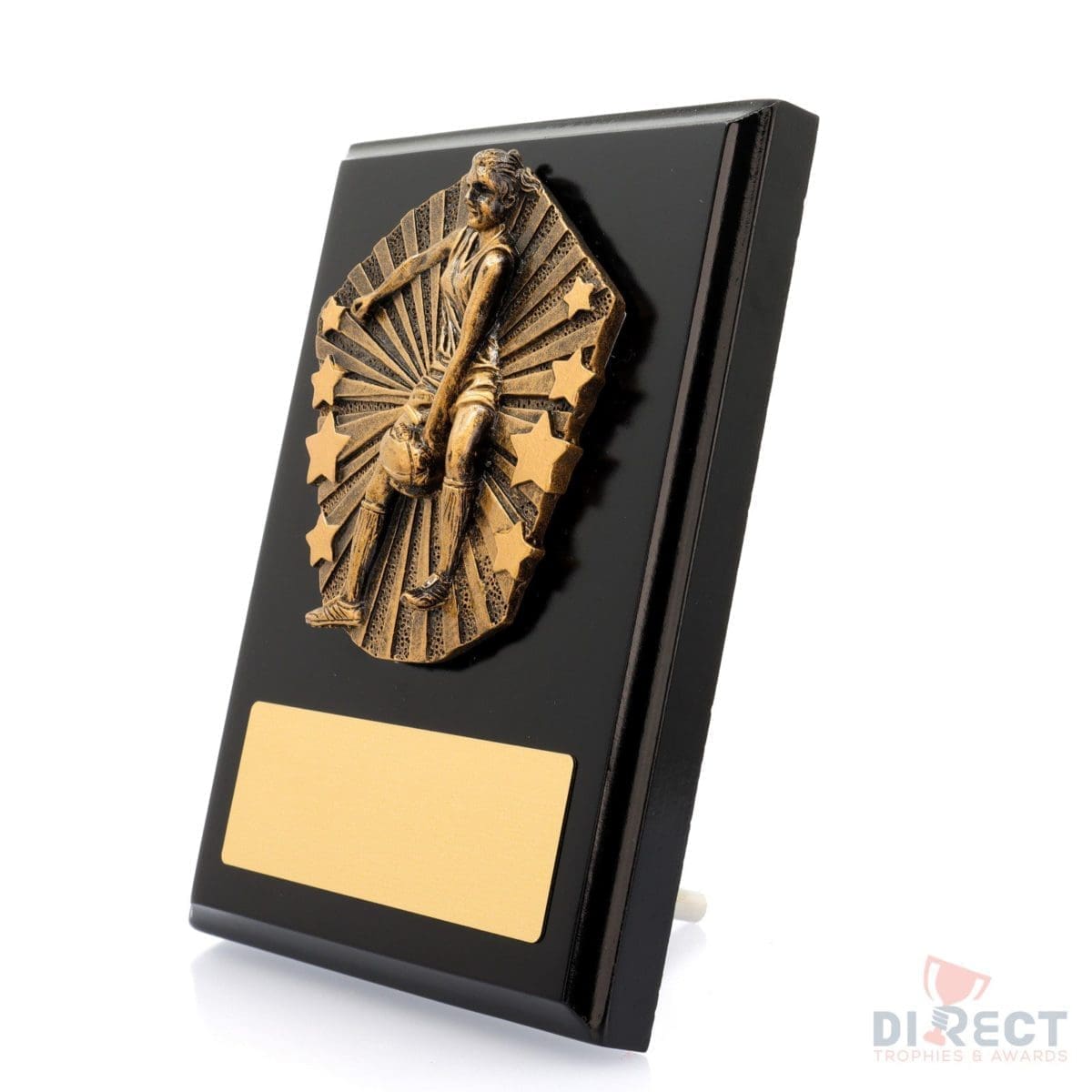 A classic gloss black plaque with brilliant Cosmos front accompanied with a european gold plate showing black text engraving. Plaque includes silver screw on stand for display. Available in 2 sizes.
