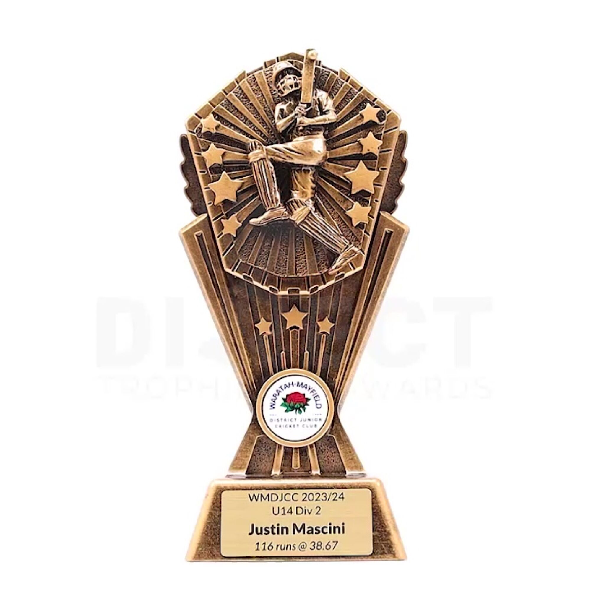 Brilliant series of ‘Cosmos’ trophies for batting awards. Available in male or female. Cricket trophies available in 3 sizes with space for insert.