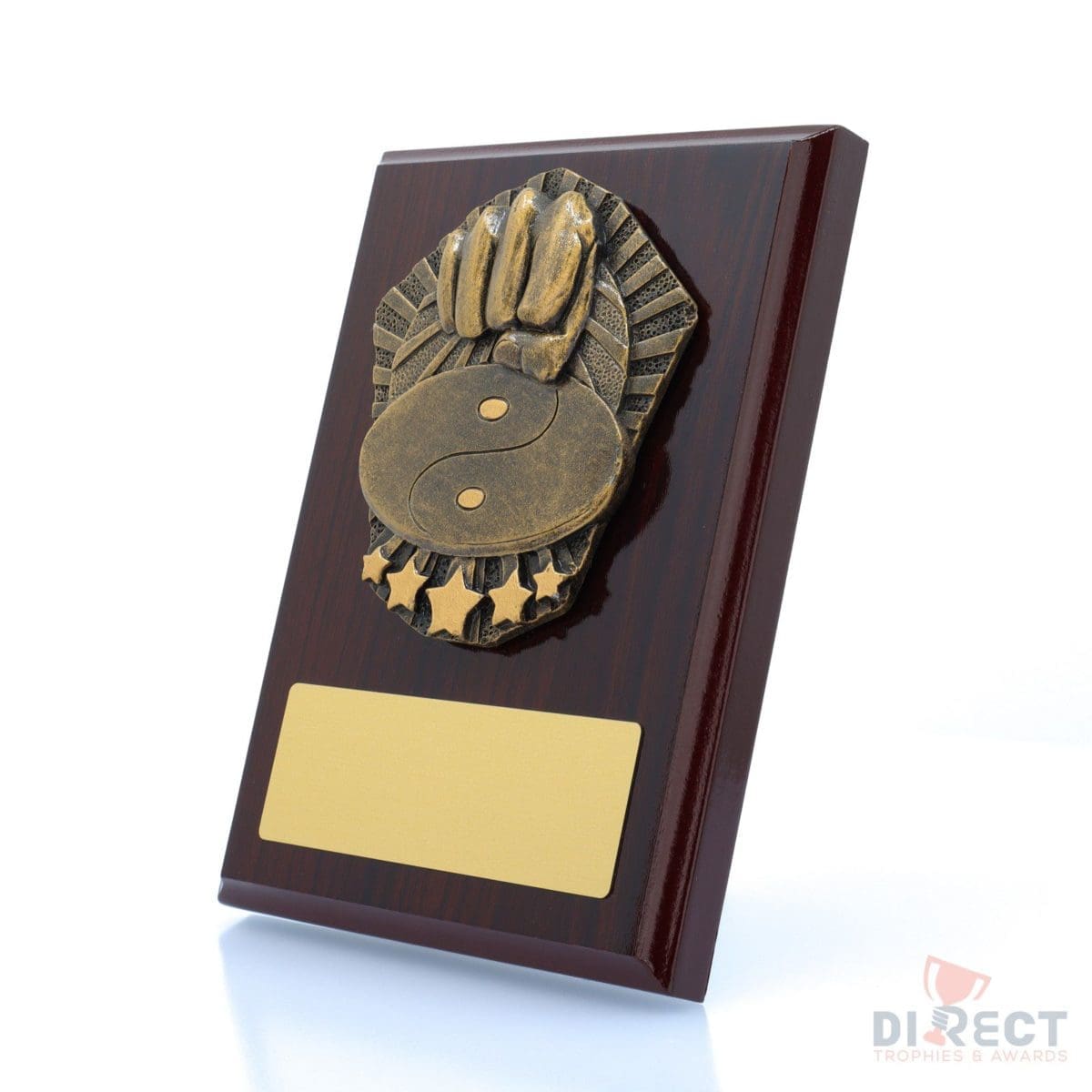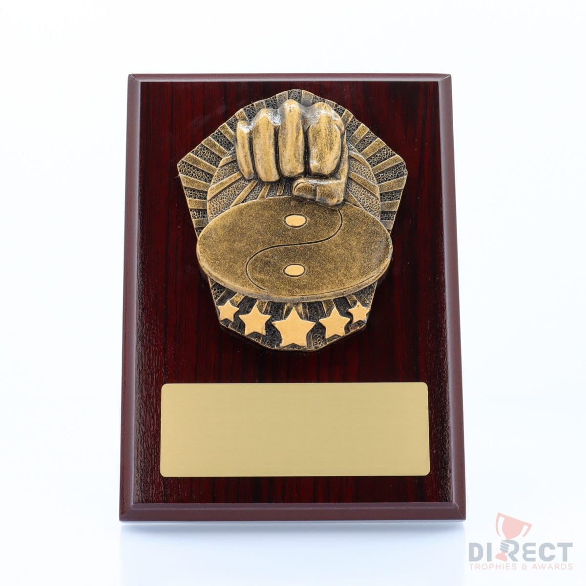 A classic gloss mahogany plaque with brilliant Cosmos front accompanied with a european gold plate showing black text engraving. Plaque includes silver screw on stand for display. Available in 2 sizes.