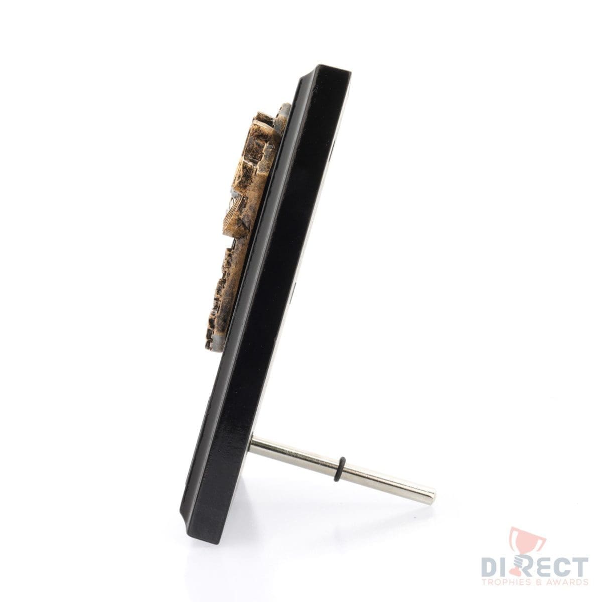 A classic gloss black plaque with brilliant Cosmos front accompanied with a european gold plate showing black text engraving. Plaque includes silver screw on stand for display. Available in 2 sizes.