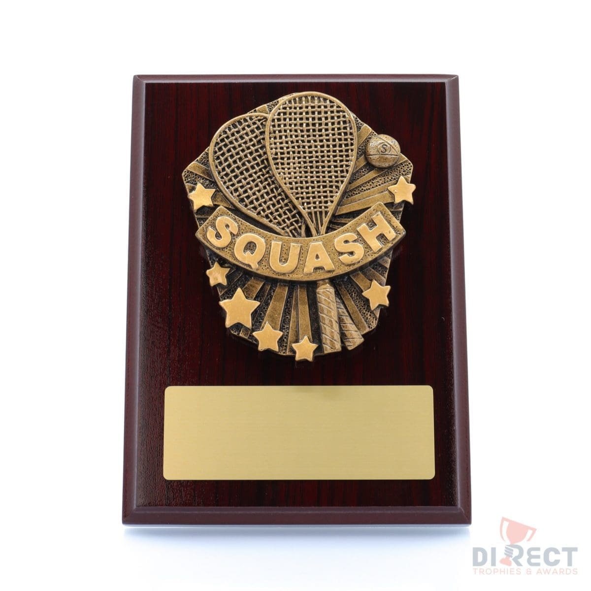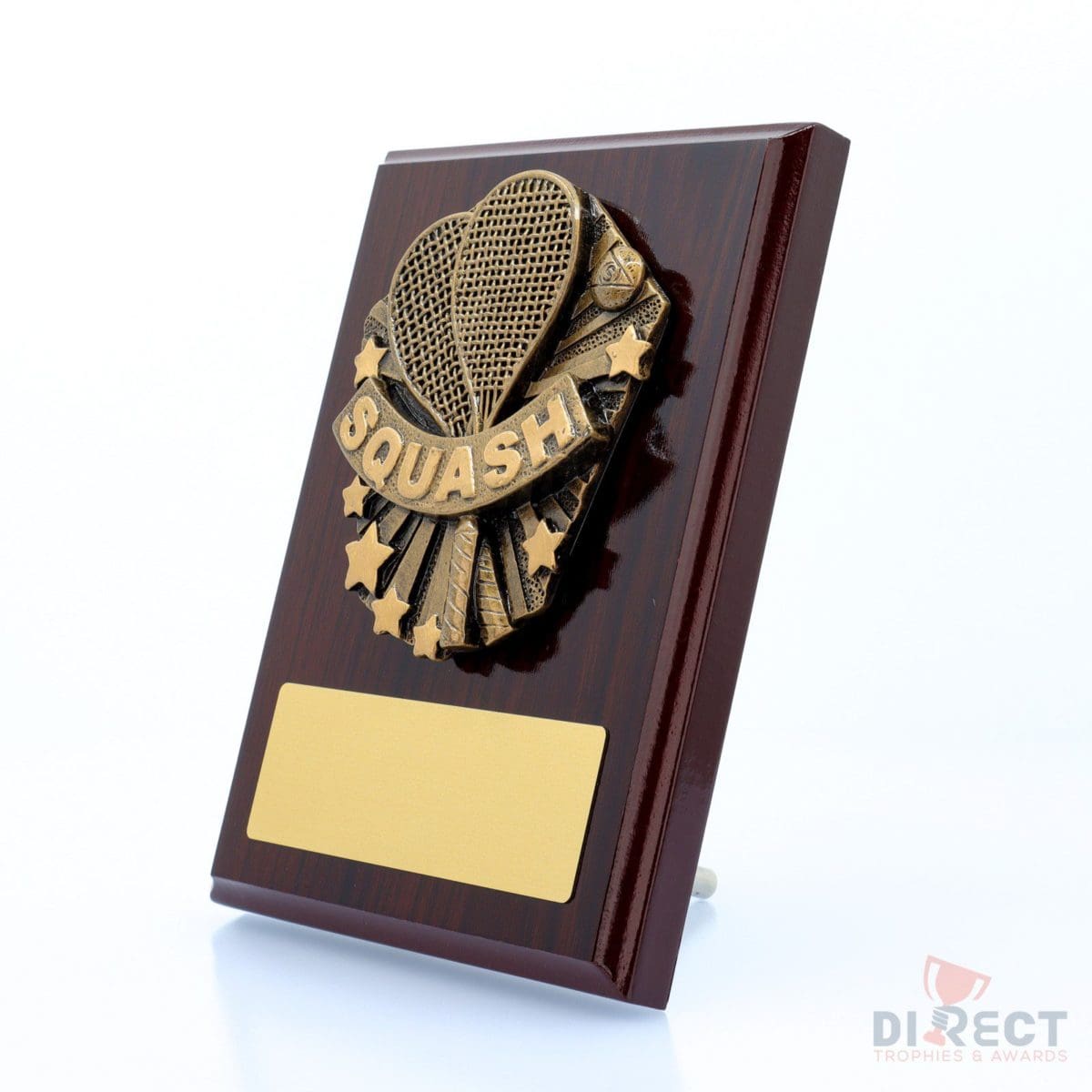 A classic gloss mahogany plaque with brilliant Cosmos front accompanied with a european gold plate showing black text engraving. Plaque includes silver screw on stand for display. Available in 2 sizes.