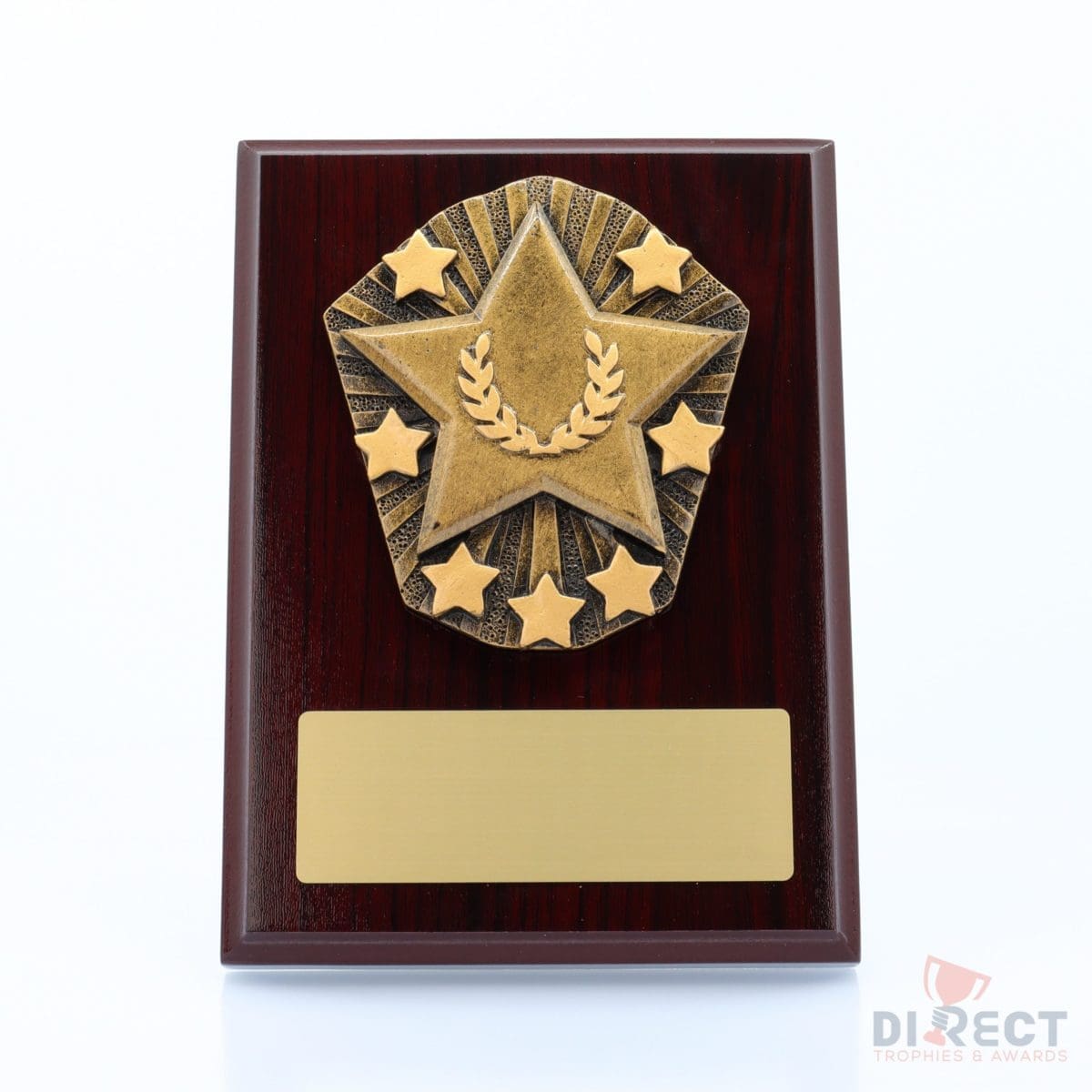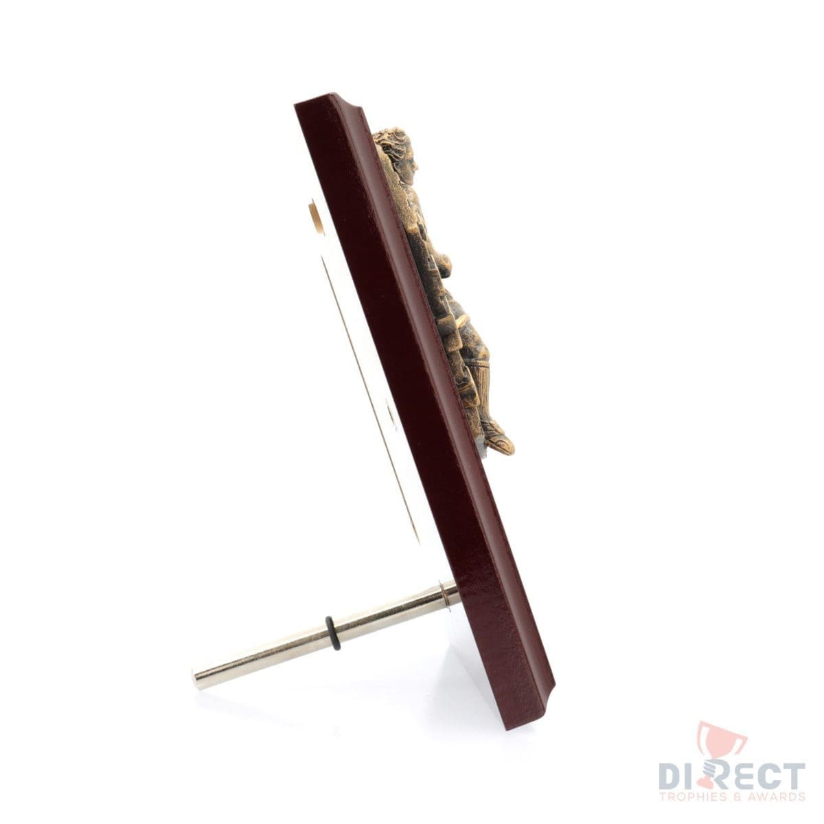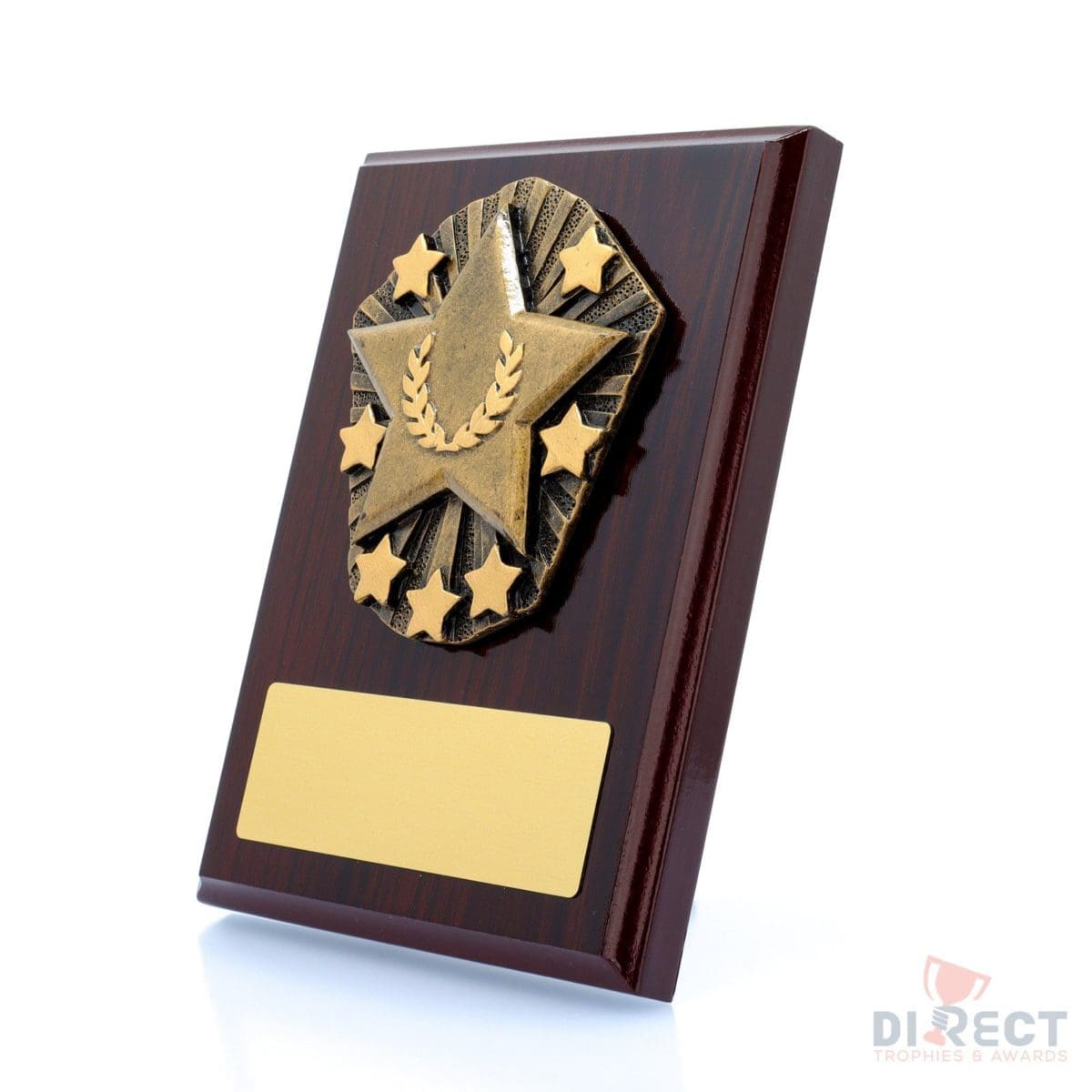 A classic gloss mahogany plaque with brilliant Cosmos front accompanied with a european gold plate showing black text engraving. Plaque includes silver screw on stand for display. Available in 2 sizes.