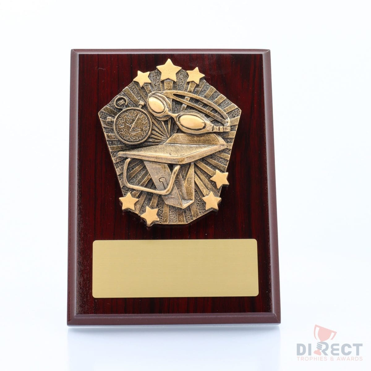 A classic gloss mahogany plaque with brilliant Cosmos front accompanied with a european gold plate showing black text engraving. Plaque includes silver screw on stand for display. Available in 2 sizes.