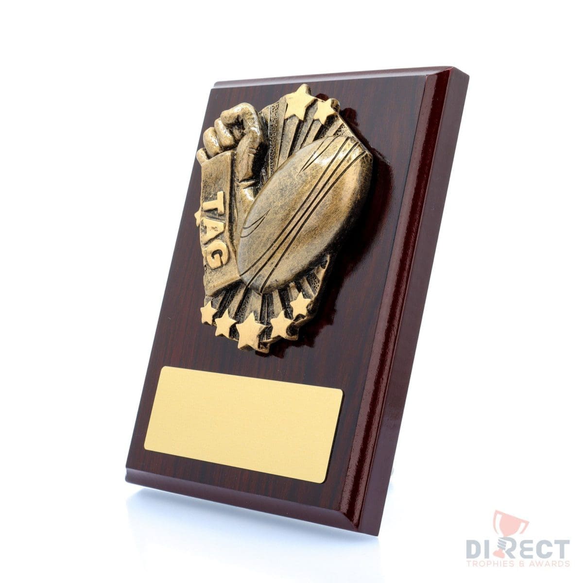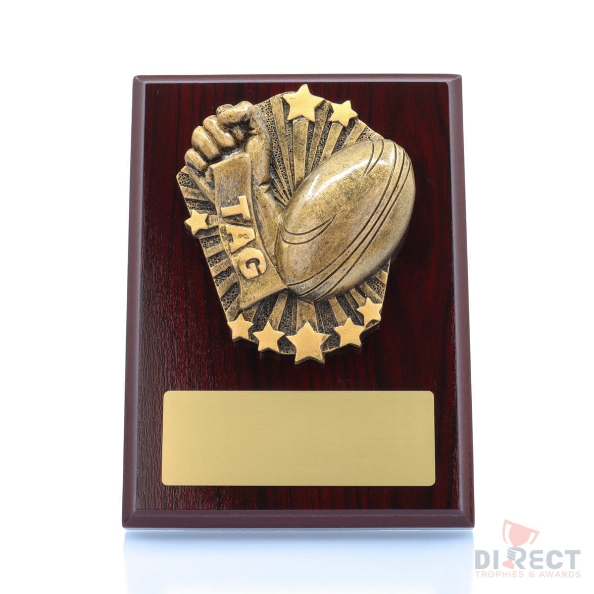 A classic gloss mahogany plaque with brilliant Cosmos front accompanied with a european gold plate showing black text engraving. Plaque includes silver screw on stand for display. Available in 2 sizes.