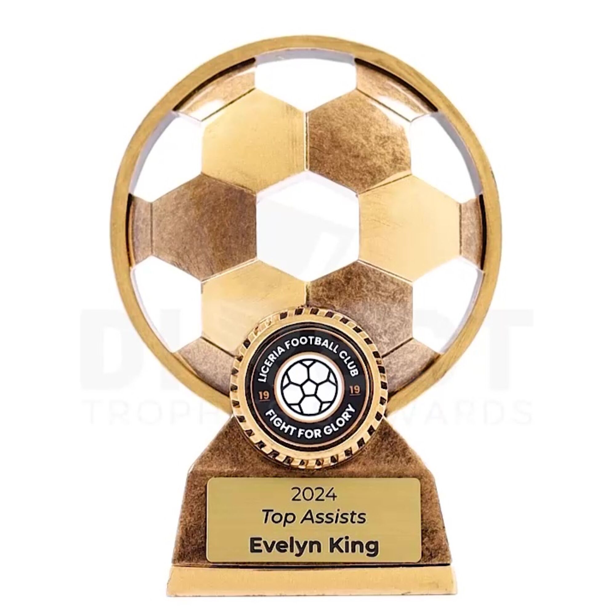 The Cretan Series Trophy features a robust gold round cut resin design, highlighting sport icons. With its thick and heavy gold finish, it offers space for your custom image and complimentary laser engraving for a standout presentation.
