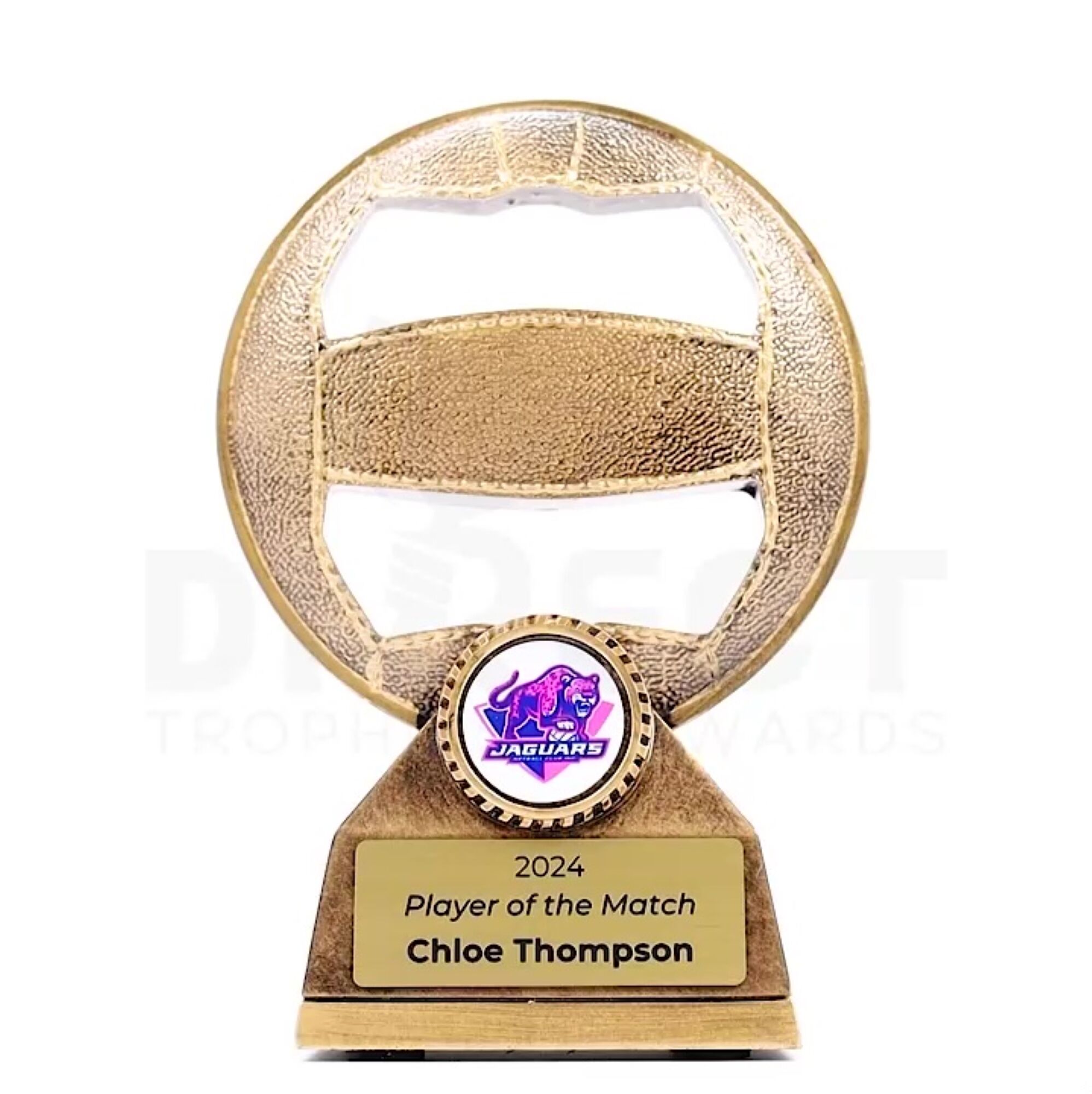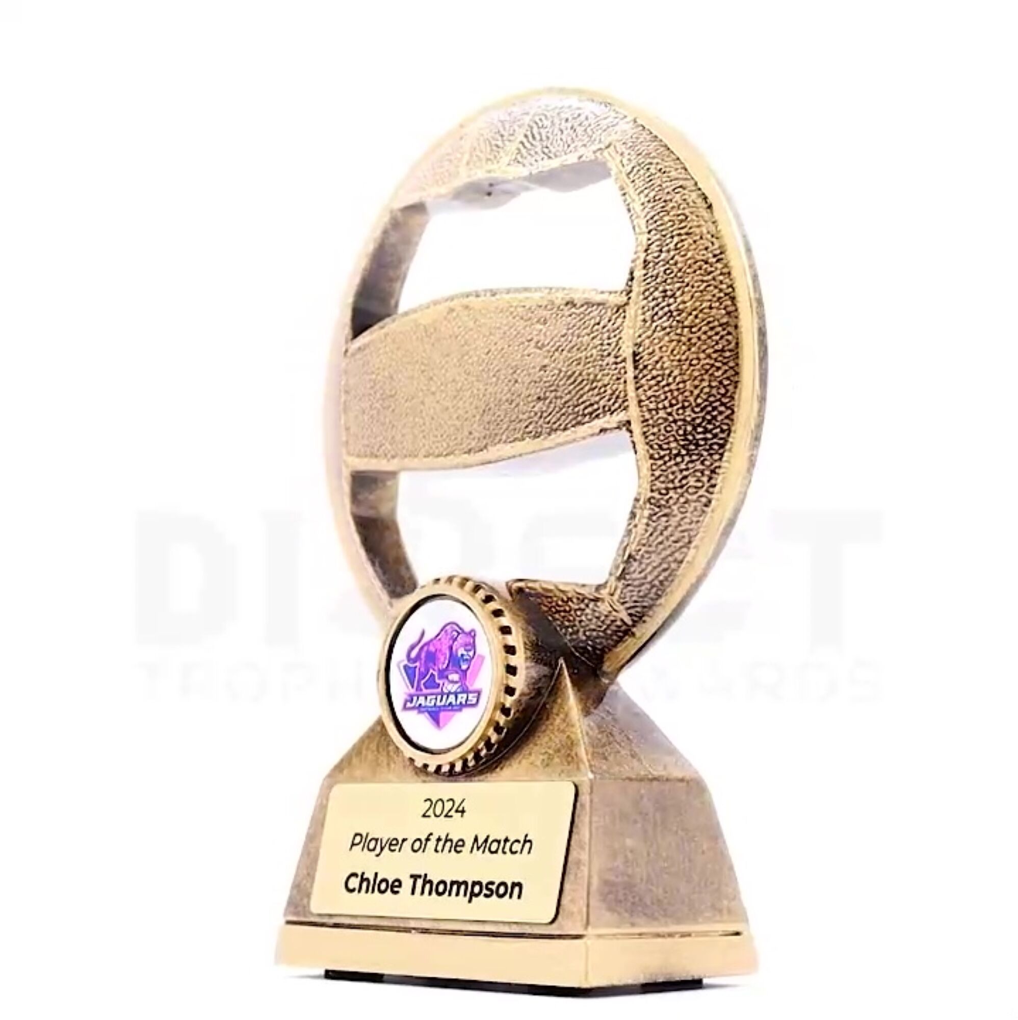 The Cretan Series Trophy features a robust gold round cut resin design, highlighting sport icons. With its thick and heavy gold finish, it offers space for your custom image and complimentary laser engraving for a standout presentation.