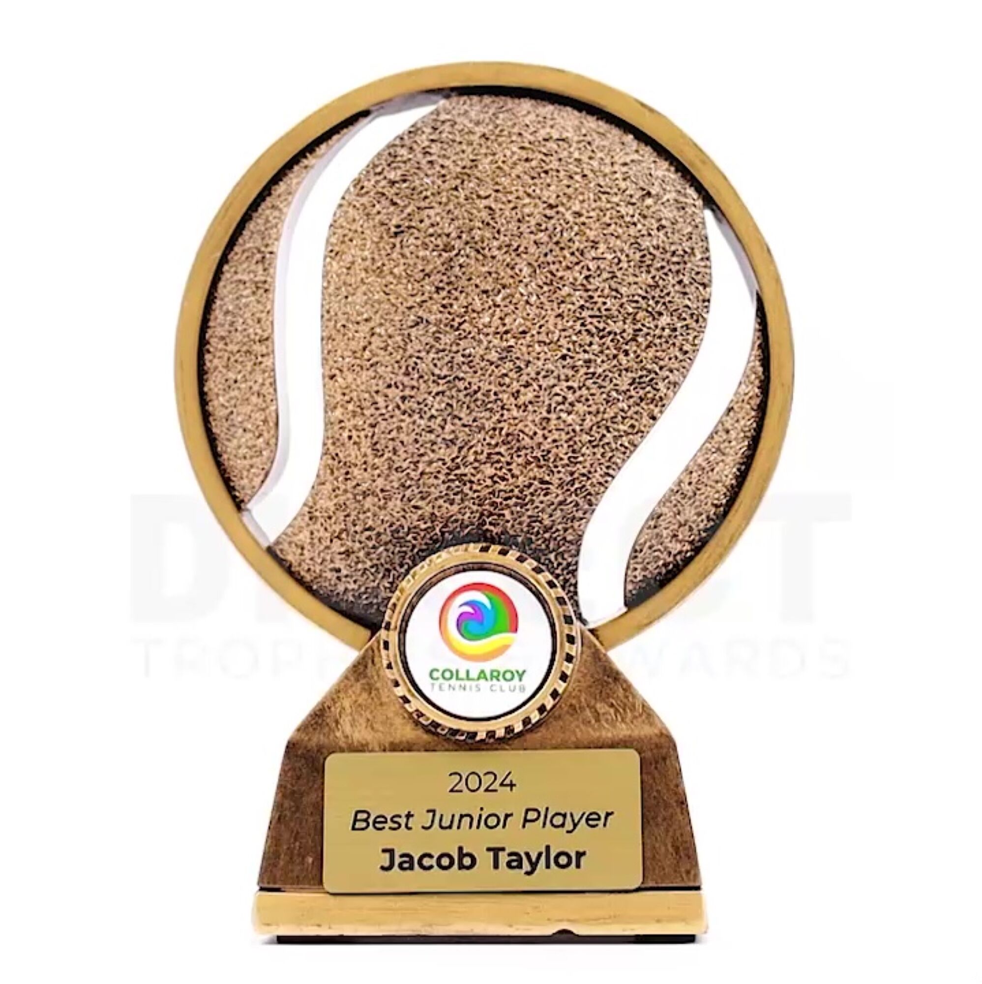 The Cretan Series Trophy features a robust gold round cut resin design, highlighting sport icons. With its thick and heavy gold finish, it offers space for your custom image and complimentary laser engraving for a standout presentation.