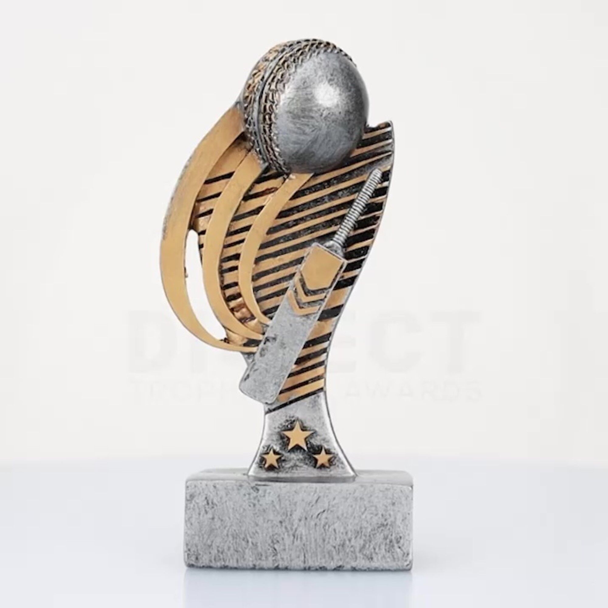 Striking design for your Cricket trophies – pair of sizes available – that feature prominent ball and bat elements and finished in classic antique silver and gold colours.
