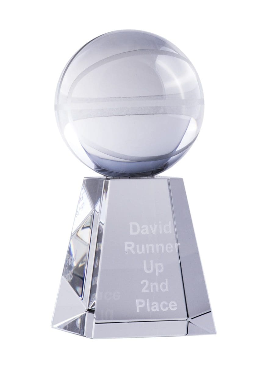 An elegant design sports award in crystal finish on base showcasing ball on award. Engraved directly on the base.