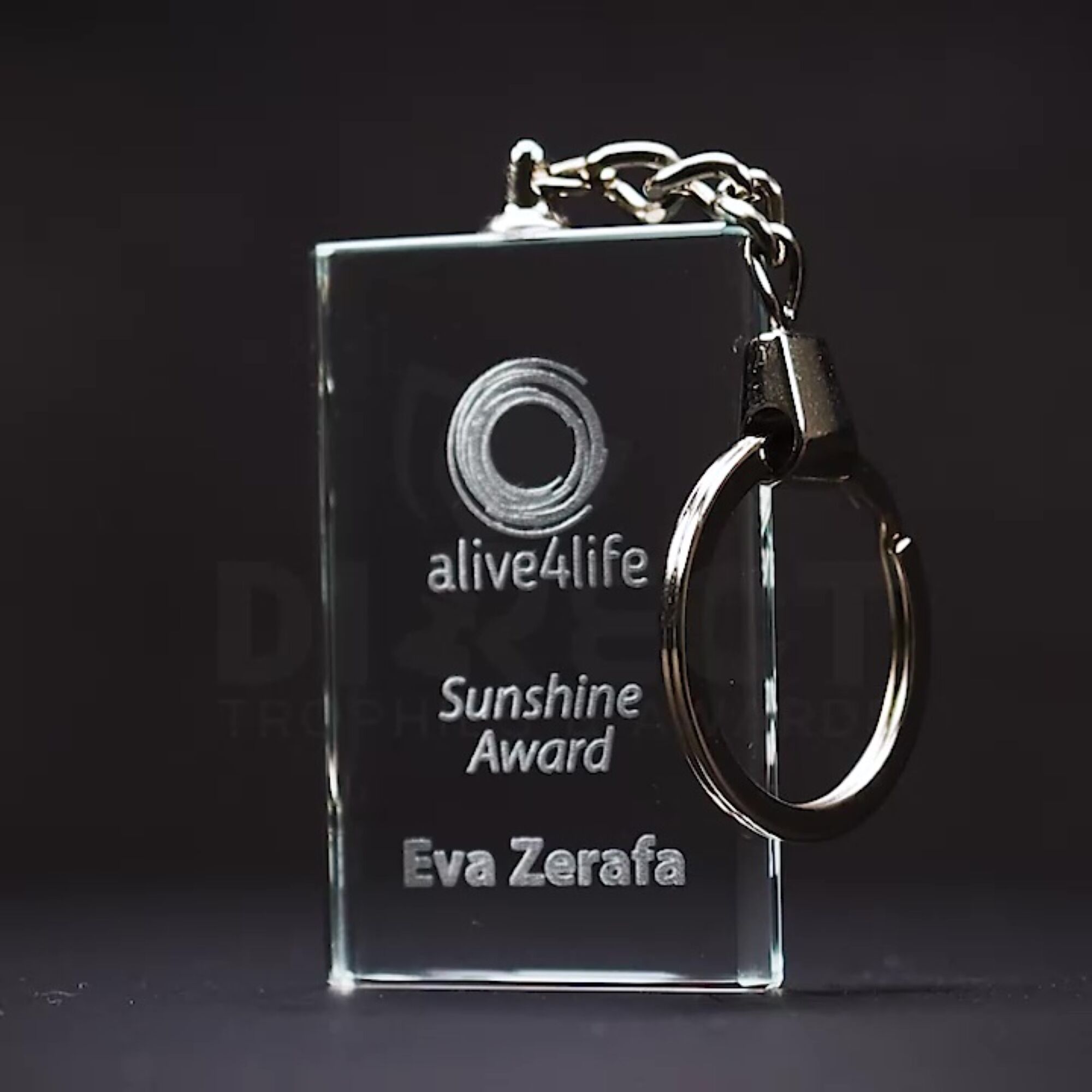 Crystal keychain award with substantial engraving space. A more premium option to a budget keychain or traditional medal.
