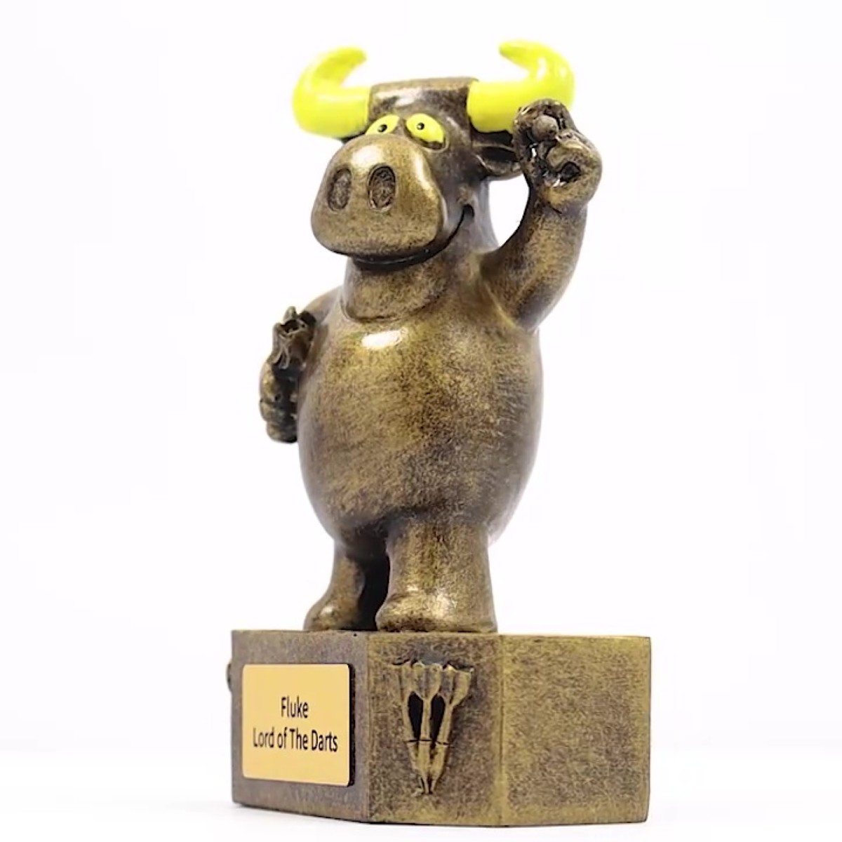 The Prize Bull in Darts is a fun, novelty trophy award for that special recipient or to award for the “bullseyes” recorded in your event or competition.