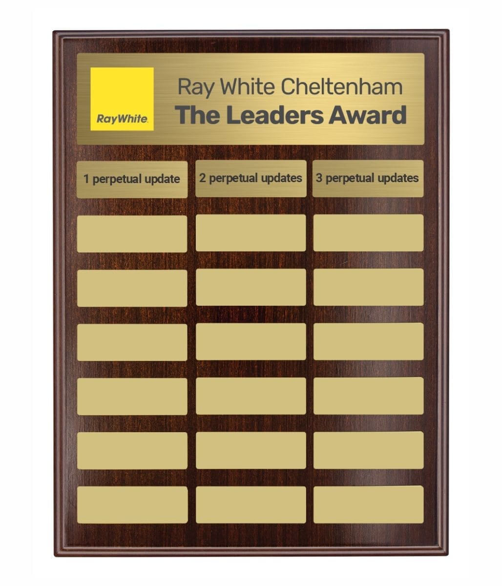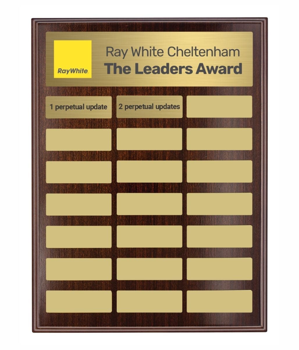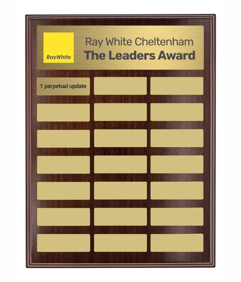 Directory Colour Perpetual Award plaque features plate place holders allowing for ease of placement for perpetual updates. This plaque is suited as an annual award & includes backstand. Full colour header plate included in the price with first perpetual update. Extra updates additional cost.