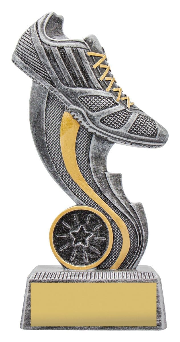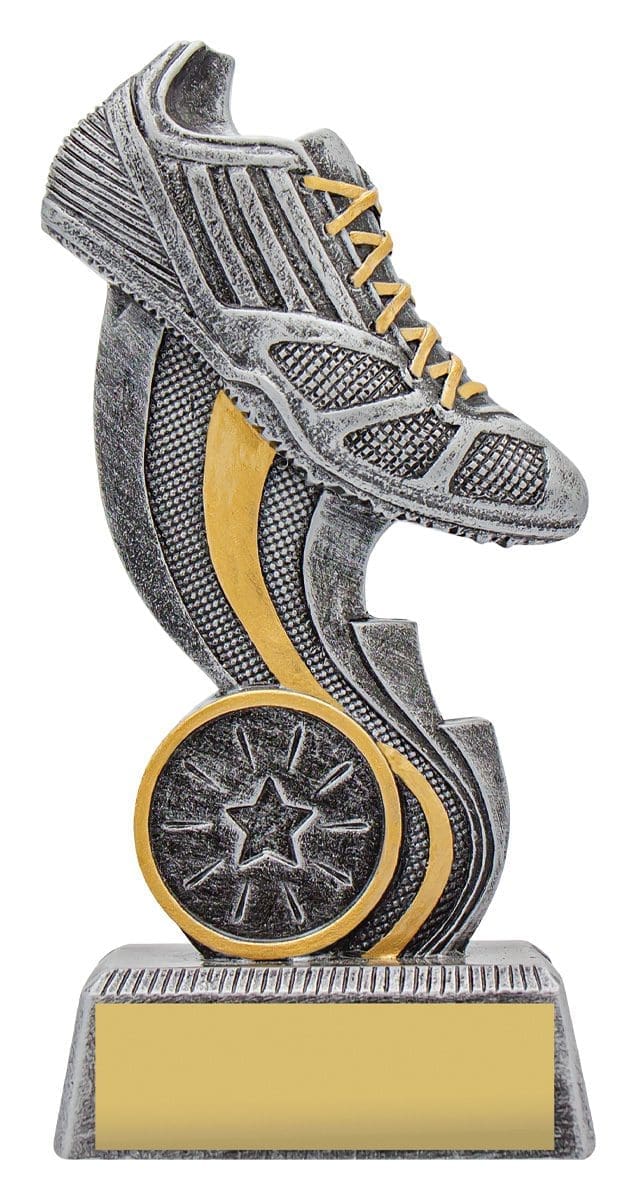 Perfect running trophies complete with dynamic design showcasing the running shoe – excellent award idea for range of athletics activities.