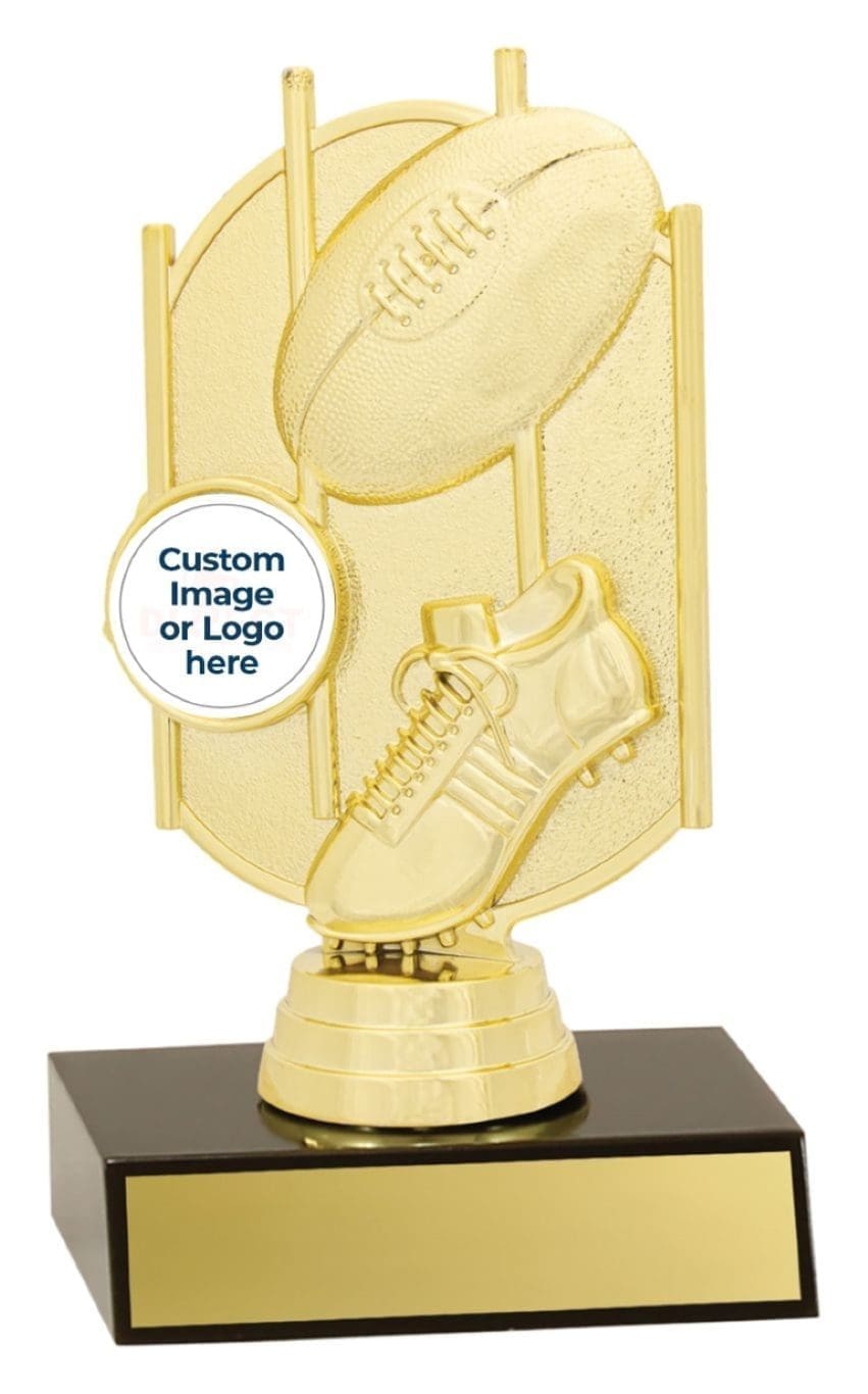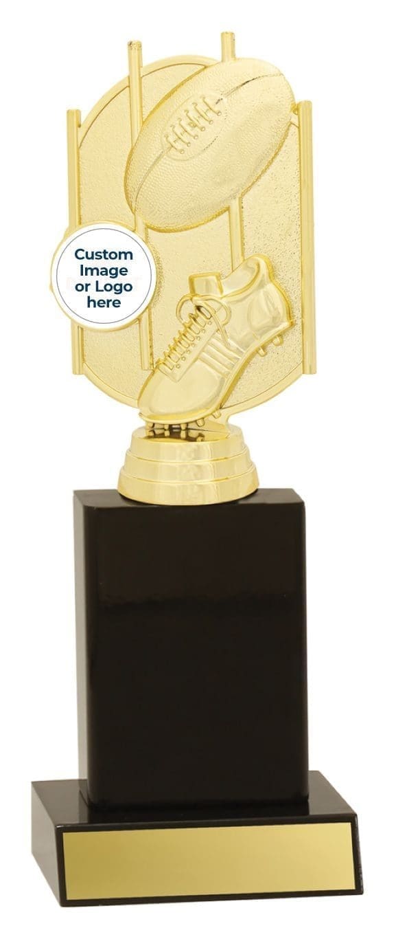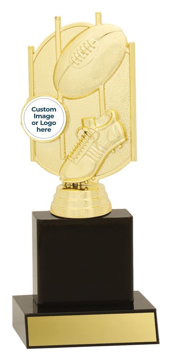 Presenting the Ebony Aussie Rules Gold Trophy, a timeless collection of column trophies specially designed for Aussie Rules enthusiasts. With its elegant gold finish and ample space for custom image or logo, this trophy is an ideal choice for honoring outstanding achievements. Enjoy the added touch of free laser engraving to make it truly personalized.