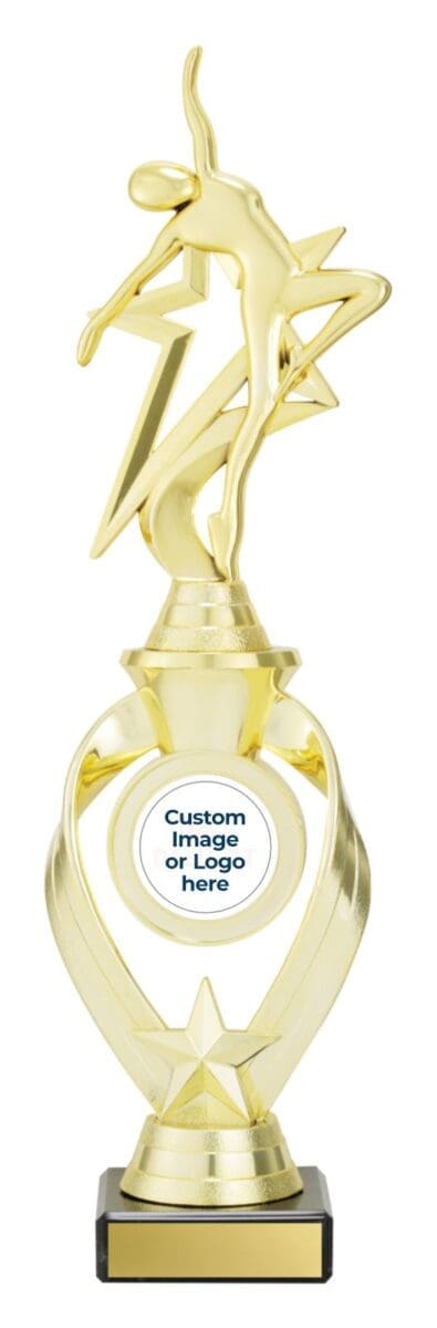 Presenting the Eclipsa Gold Dancer Trophy, a stunning award for dancers who shine. The trophy showcases a mesmerizing star-inspired riser that adds an extra touch of elegance. Completed with a premium black marble base, this trophy is the perfect choice for recognizing outstanding dance performances. Personalize it with free laser engraving to make it truly special.