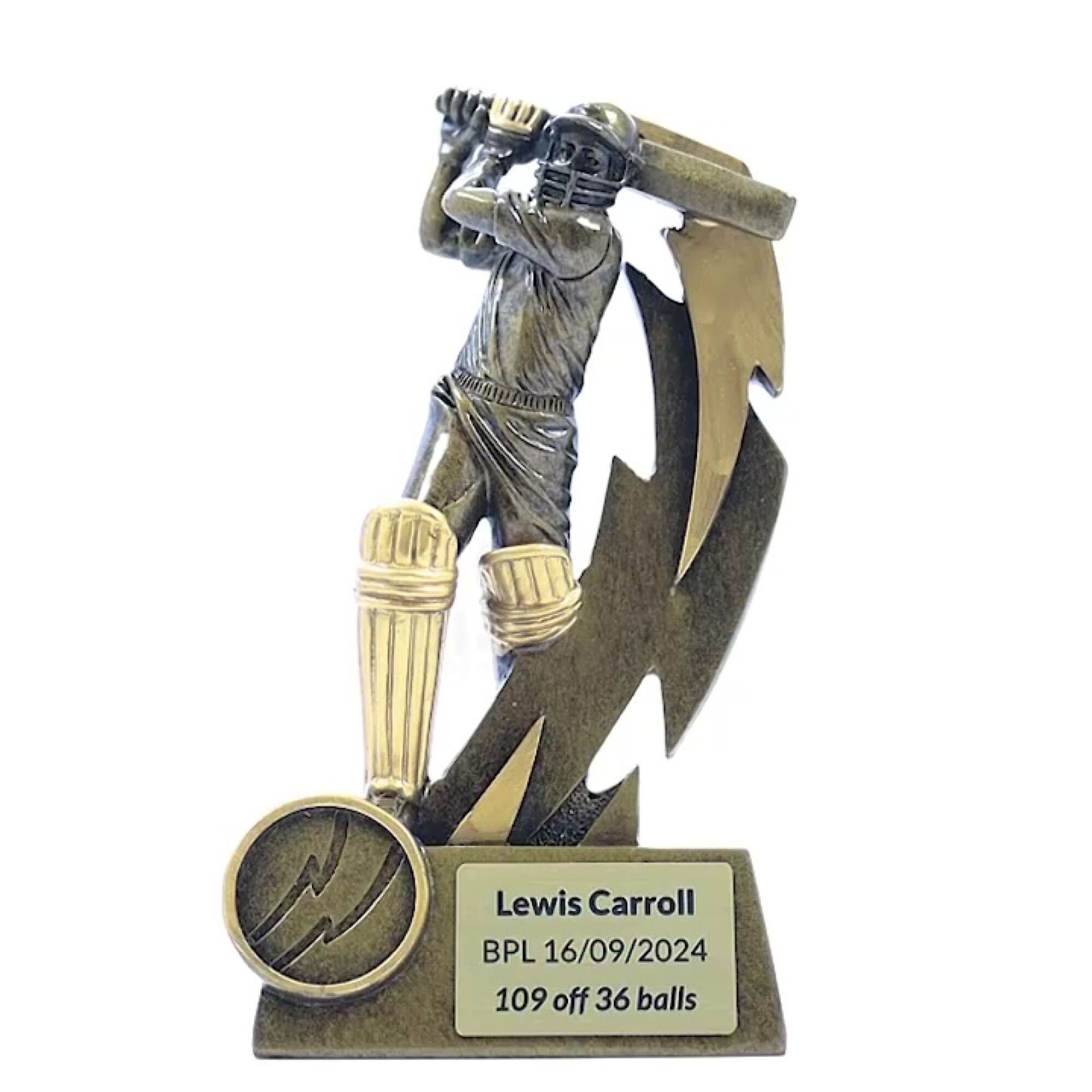 Introducing the Electrify Trophy Series: Marvel at the dynamic player captured in action with remarkable detail. Finished in a timeless classic gold color, it exudes elegance. Take advantage of our free laser engraving service to personalize your trophy. Available in various sizes, it’s the perfect choice to celebrate accomplishments in style.
