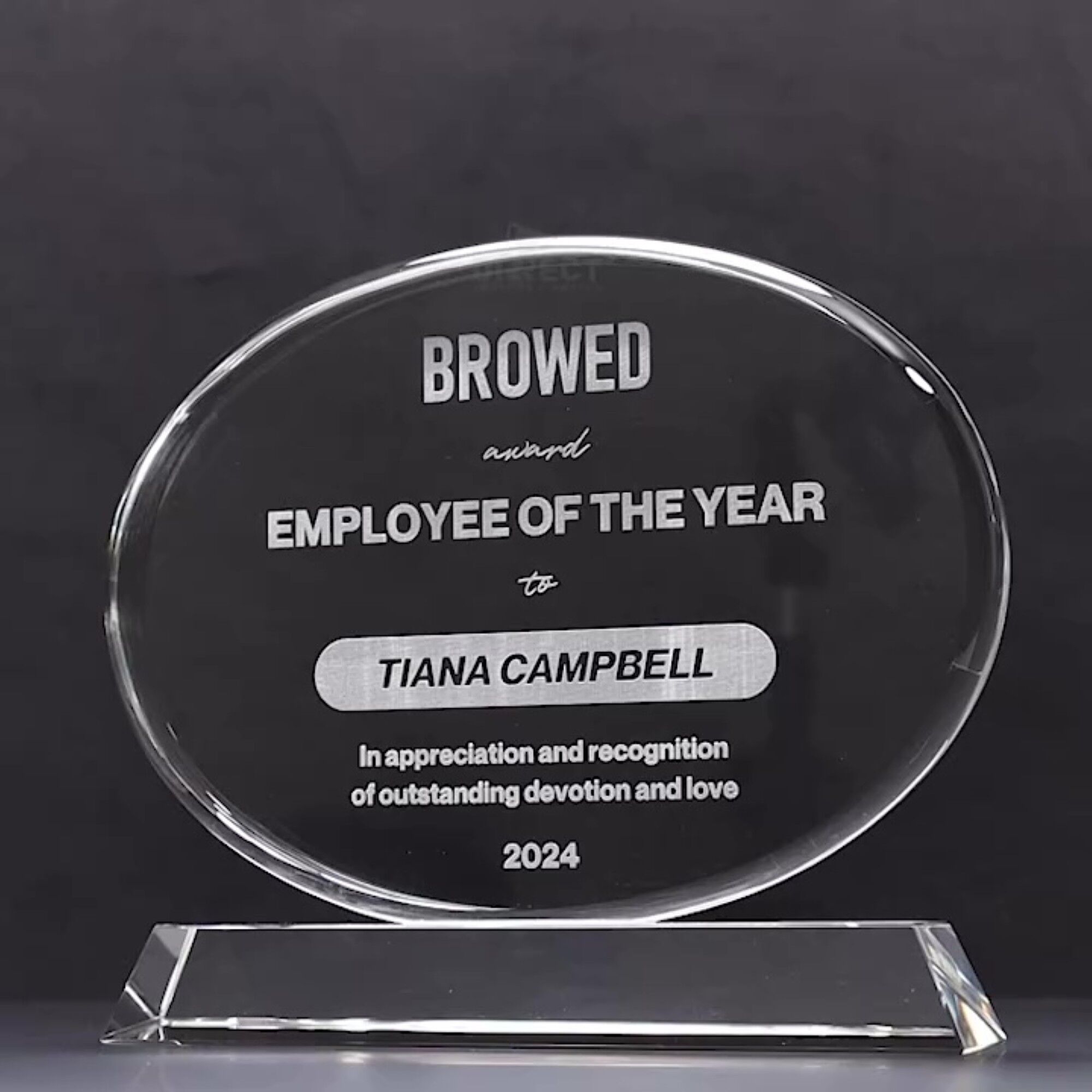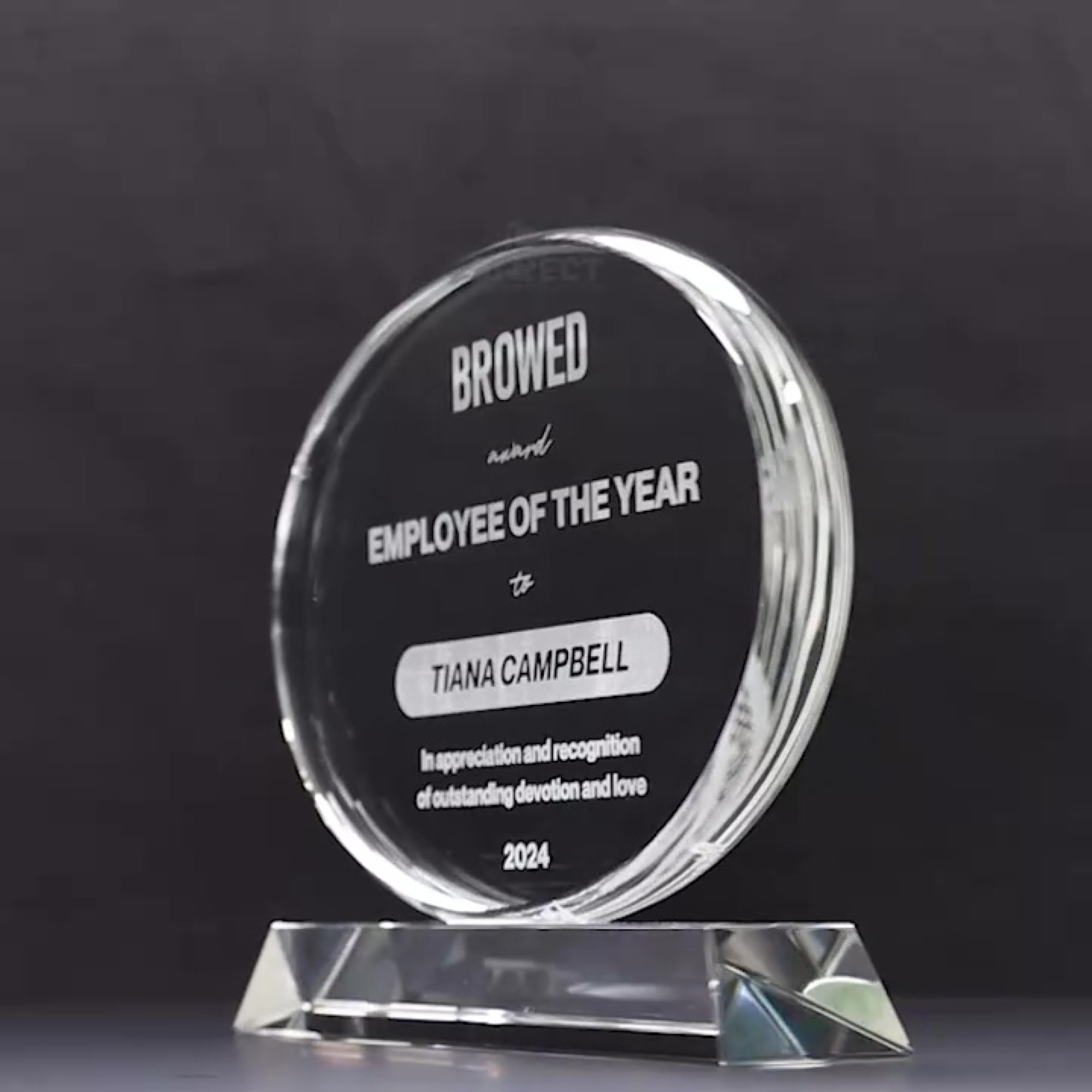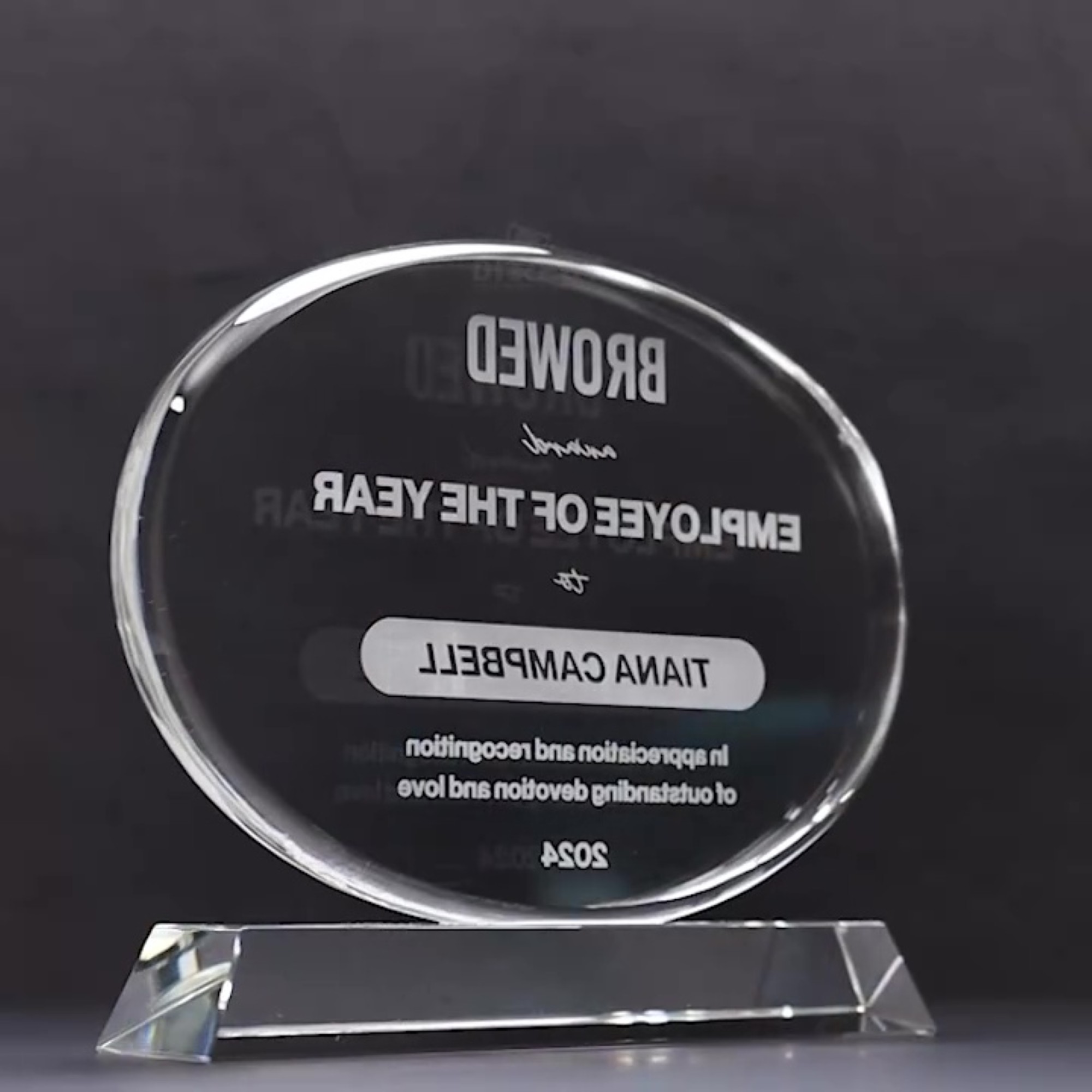 A refined crystal award featuring a sleek oval silhouette atop a sturdy base. Perfect for recognising excellence, this timeless piece comes elegantly packaged in a gift box and includes complimentary laser engraving for a personalised finish.